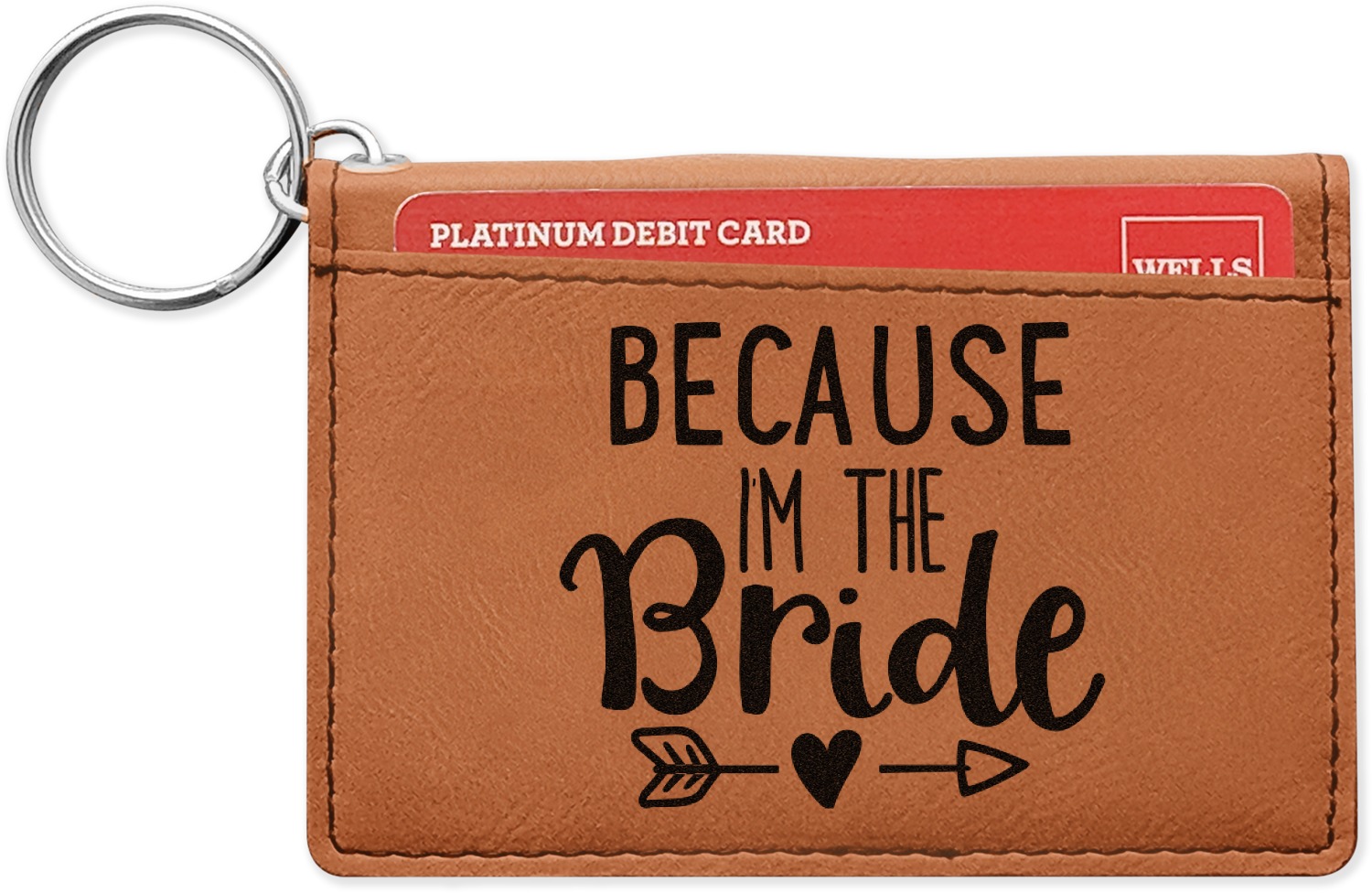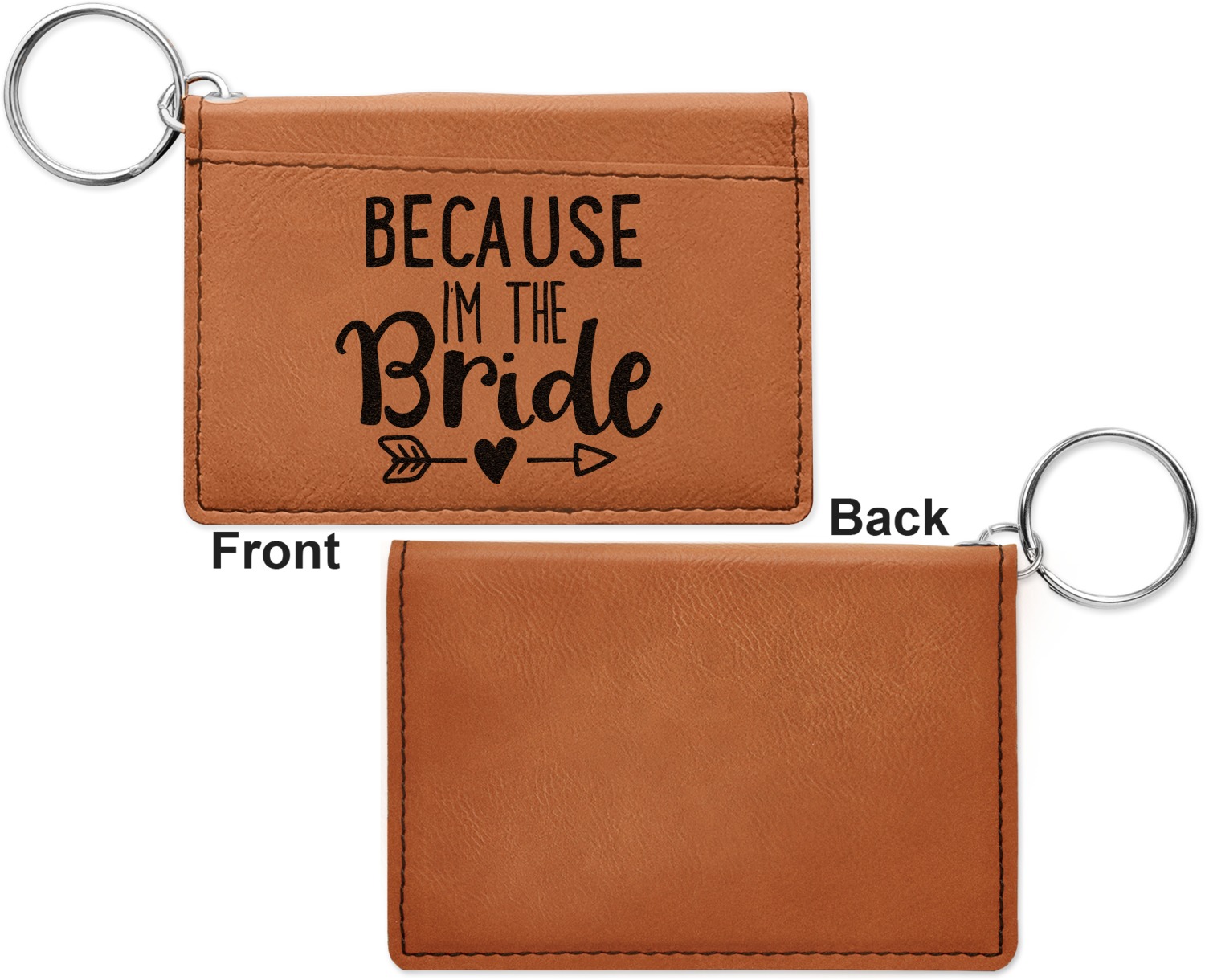 These ID wallet keychains features three pockets on the inside to accommodate your ID and your most frequently used cards. Another pocket occupies the front of the wallet's exterior, and can hold some cash or another card. The wallet is accompanied by a thick metal ring for easy attachment to a belt clip or purse. Each card holder keychain measures at 4.25 by 3 inches and is a beautiful, cognac, medium-brown shade. The personalized monogram, font, or graphic of your choosing is laser engraved into the surface of the wallet, creating a black imprint. We sell these ID wallets in two models: single sided and double sided engraving.