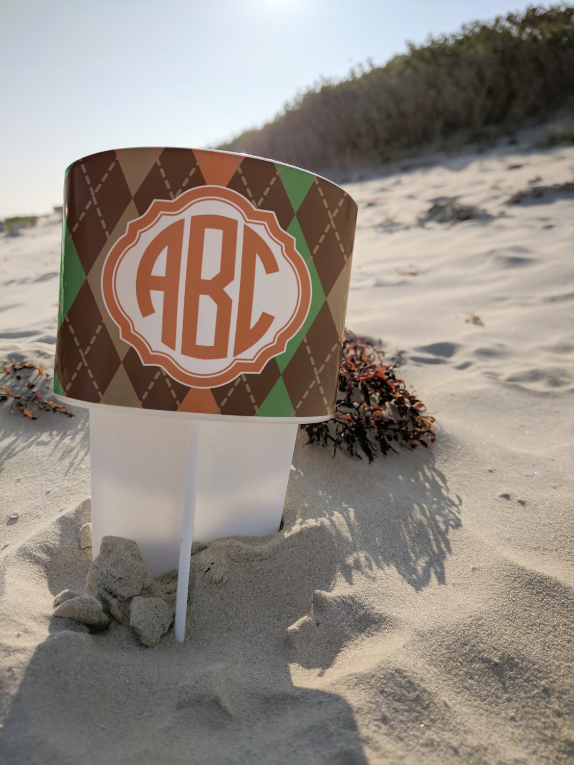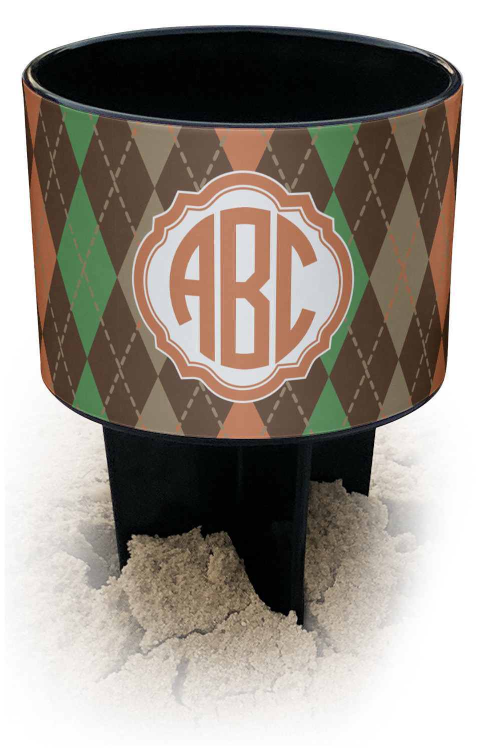 This cup holder has a large stake at its bottom that anchors it to the sand or ground below, while the cup holder rests above the stake. The entire drink holder is made of durable plastic and displays your customization around the cup holder portion. We sell these personalized beach spikers in two different colors: black and white.