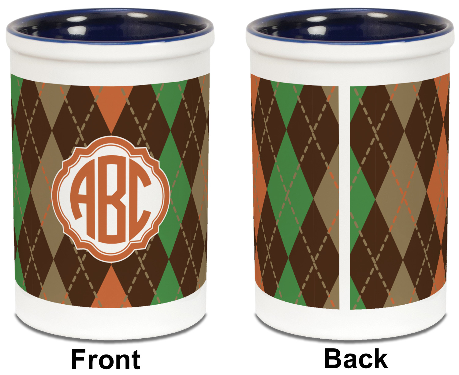 Both the blue and black pencil holders are a ceramic material, giving you a sturdy and long-lasting pen and pencil holder. We print your designs on the exterior of the pencil cup, covering most of the outside surface. There is a small white border on the top and bottom of the exterior of the pen holder, setting apart your design from the interior's color. Our ceramic pen caddy is roughly 3.5" x 3.5" x 5" in dimensions.