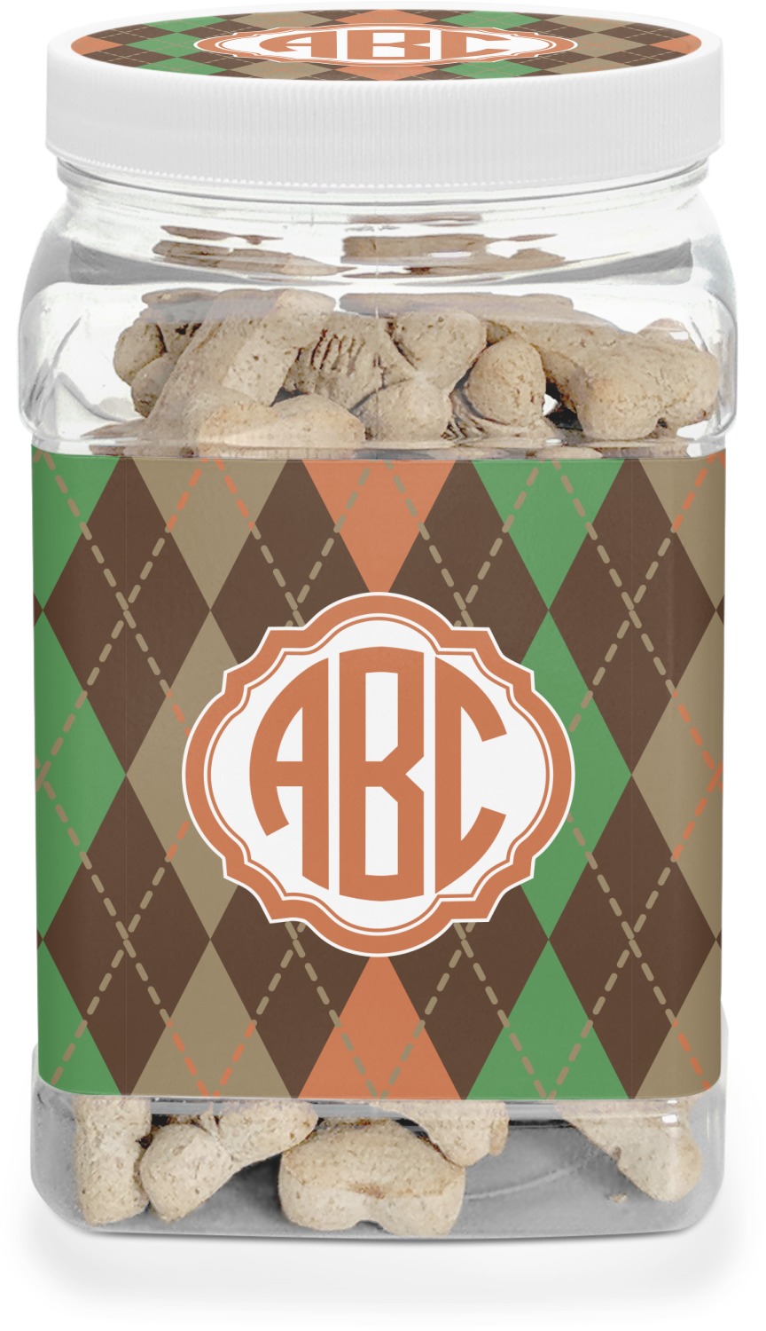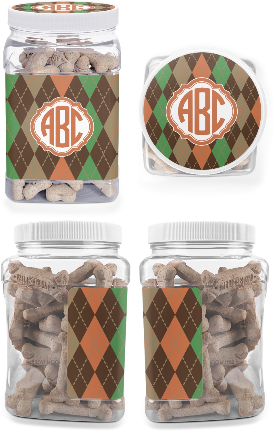 This half gallon jar, made from a sturdy plastic, is the perfect way to keep treats from any naughty pet paws, while still keeping them ready on hand for when your pup performs an impressive trick. This dog cookie jar features a screw-on, white lid that displays your personalized design on a vinyl sticker. We apply another customized sticker that wraps around the front and sides of the jar. Our dog treat jar also has indentations on the rear ends of the sides, which allows for convenient handling, and its square frame allows for easy storage.