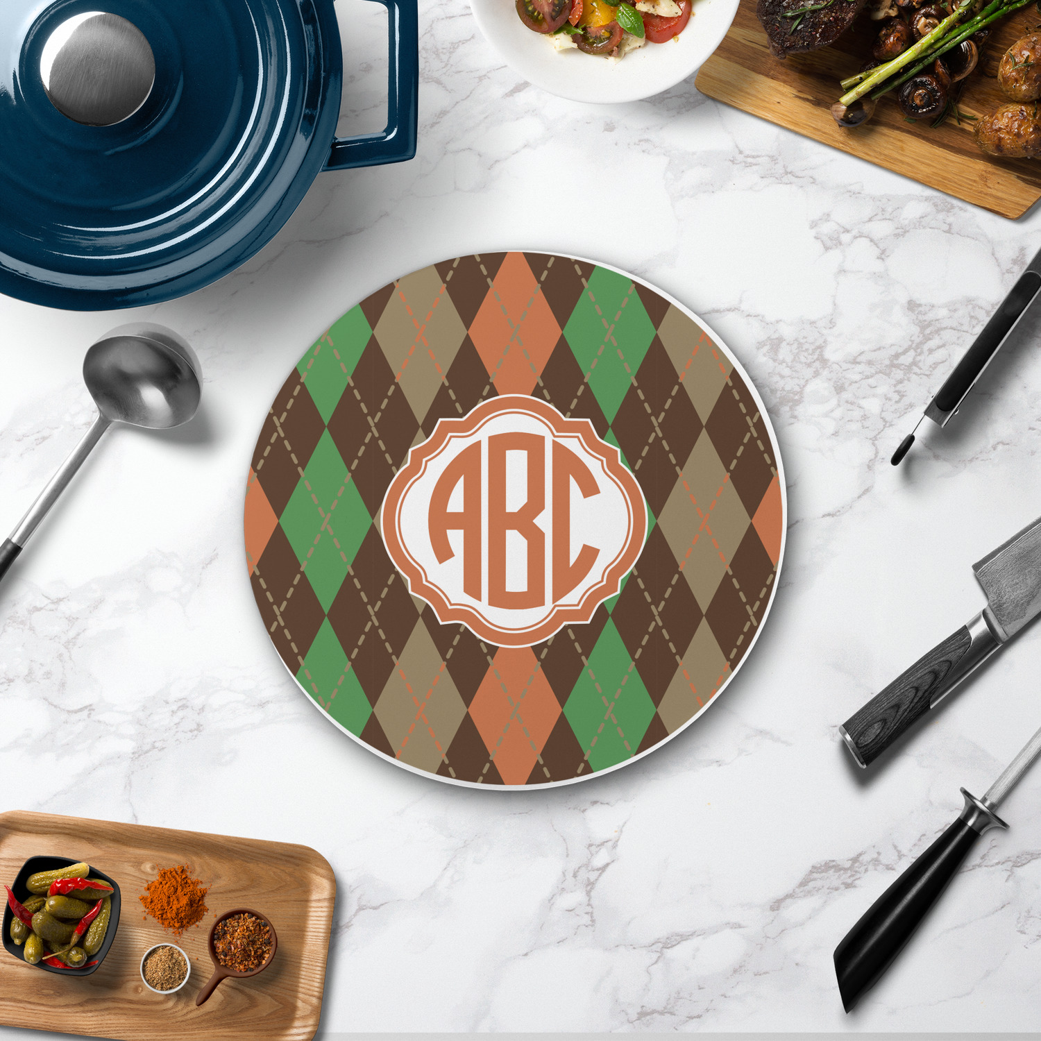 The round trivets can be customized with your own design, your own photo, or your own logo. You can add personalization, like a monogram, family name or initial to your uploaded design / art. You can also customize one of our designs and change the patterns, colors, personalization, fonts etc.