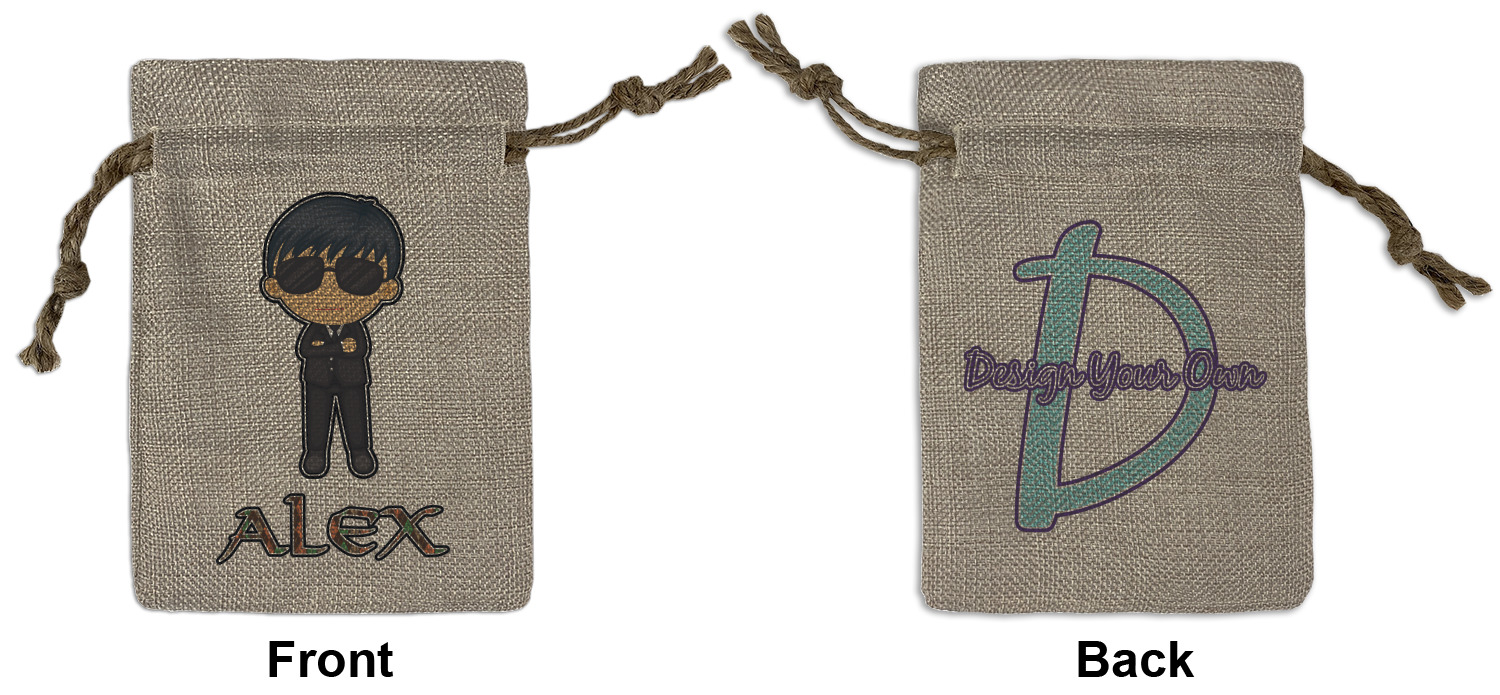 We sell our Burlap Gift Bags in 3 variant sized bags. Made with burlap polyester, each personalized bag can be secured with a twine drawstring pull. Your custom design is available to print on one side or both sides - completely up to you! The sizes of the bags measure approximately 4.5" x 6.5" for the smallest size, 6.5" x 8.0" for the medium size, and 6.5" x 13.5" for the large-sized bag.