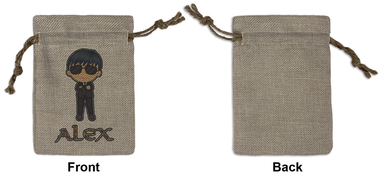 We sell our Burlap Gift Bags in 3 variant sized bags. Made with burlap polyester, each personalized bag can be secured with a twine drawstring pull. Your custom design is available to print on one side or both sides - completely up to you! The sizes of the bags measure approximately 4.5" x 6.5" for the smallest size, 6.5" x 8.0" for the medium size, and 6.5" x 13.5" for the large-sized bag.