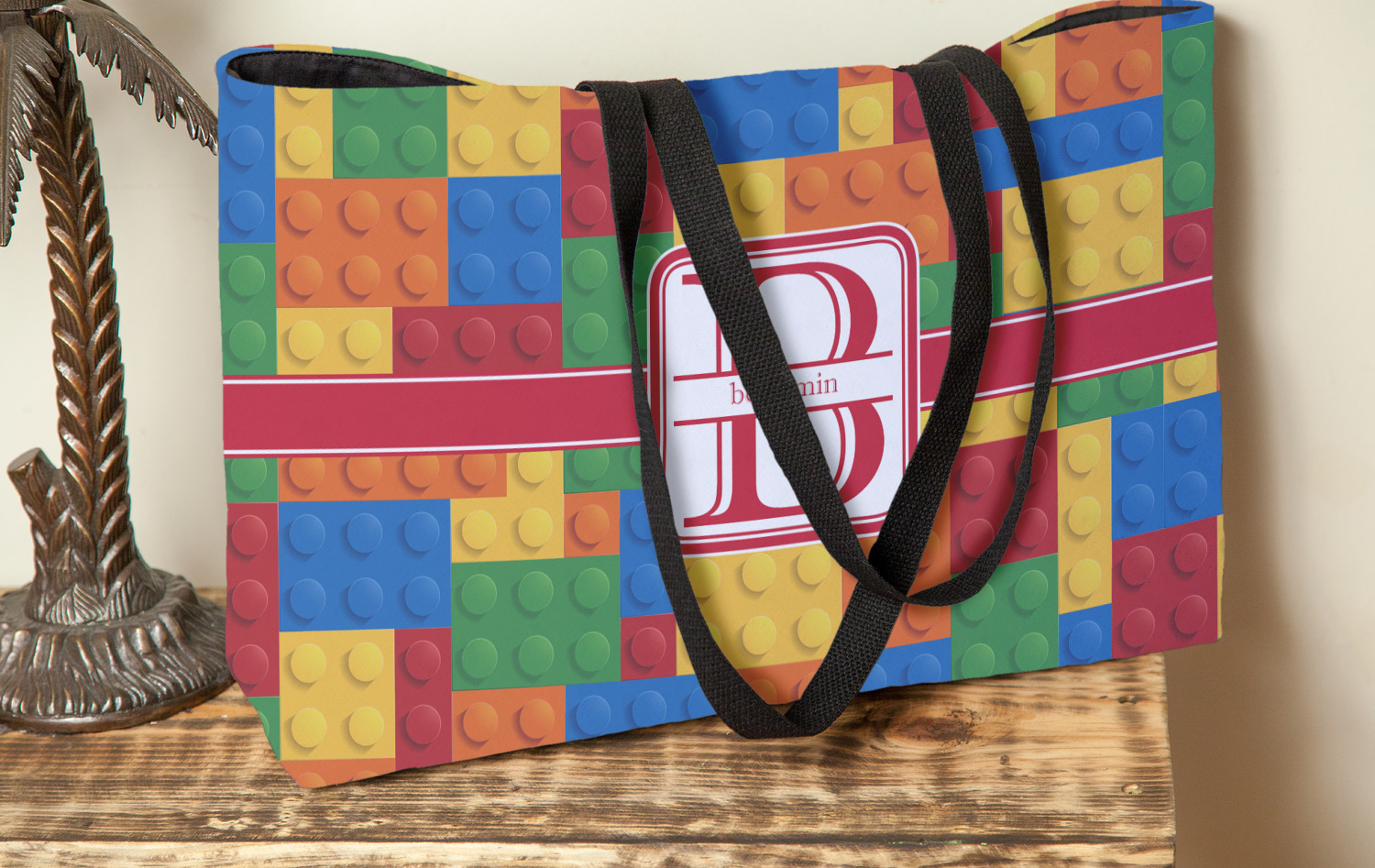 These beach totes are handmade here in the USA. Fabric is printed with your design. The tote is then sewn from the fabric pieces, lining and handles added.