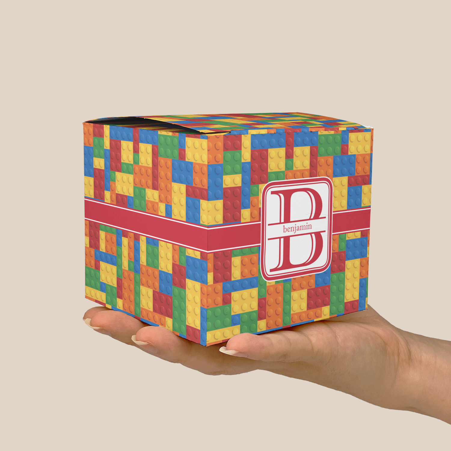 This building blocks design is made up of blocks of different shapes. sizes and colors all fitted together. We have featured a red ribbon along with square label and an initial and name for personalization.