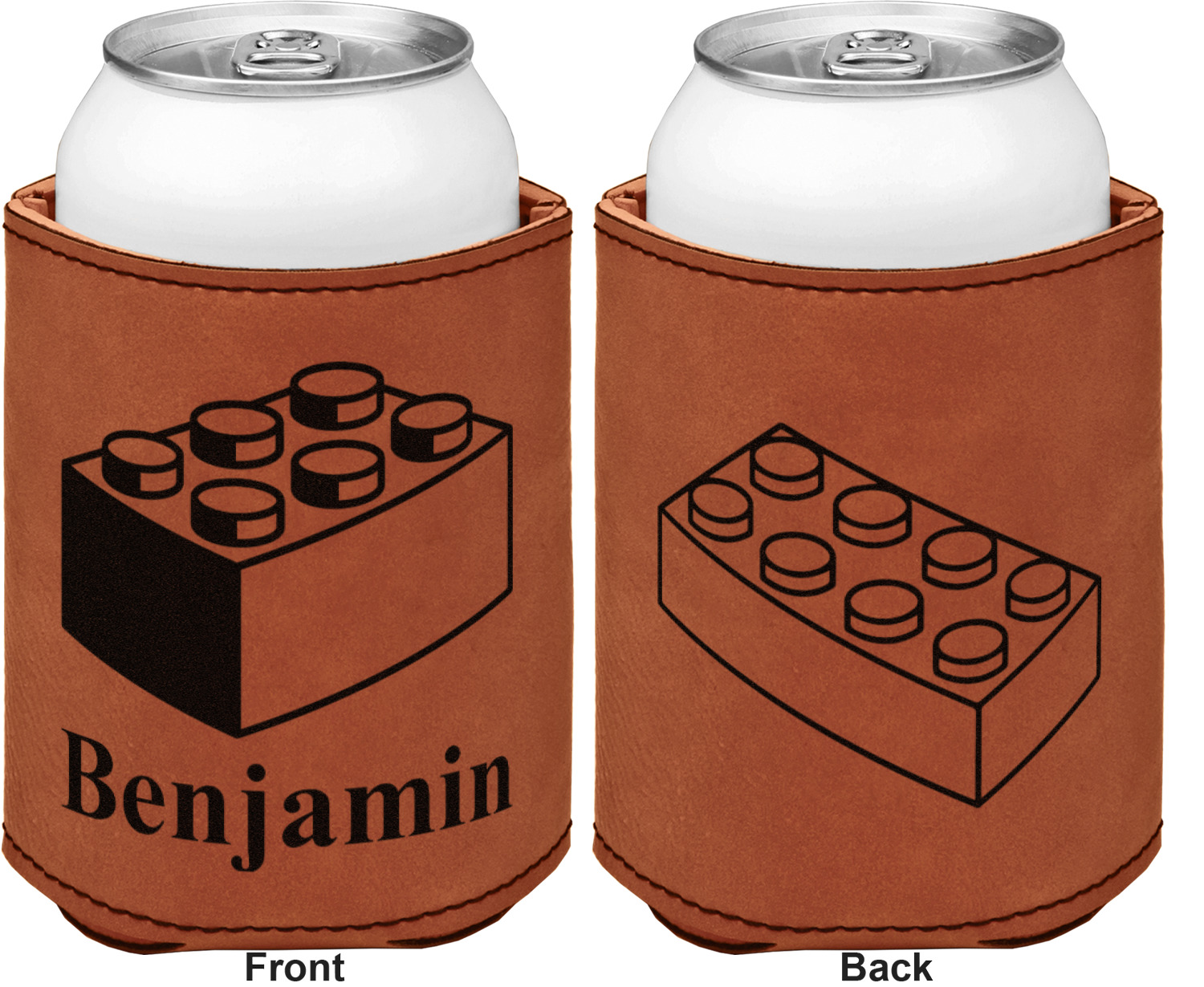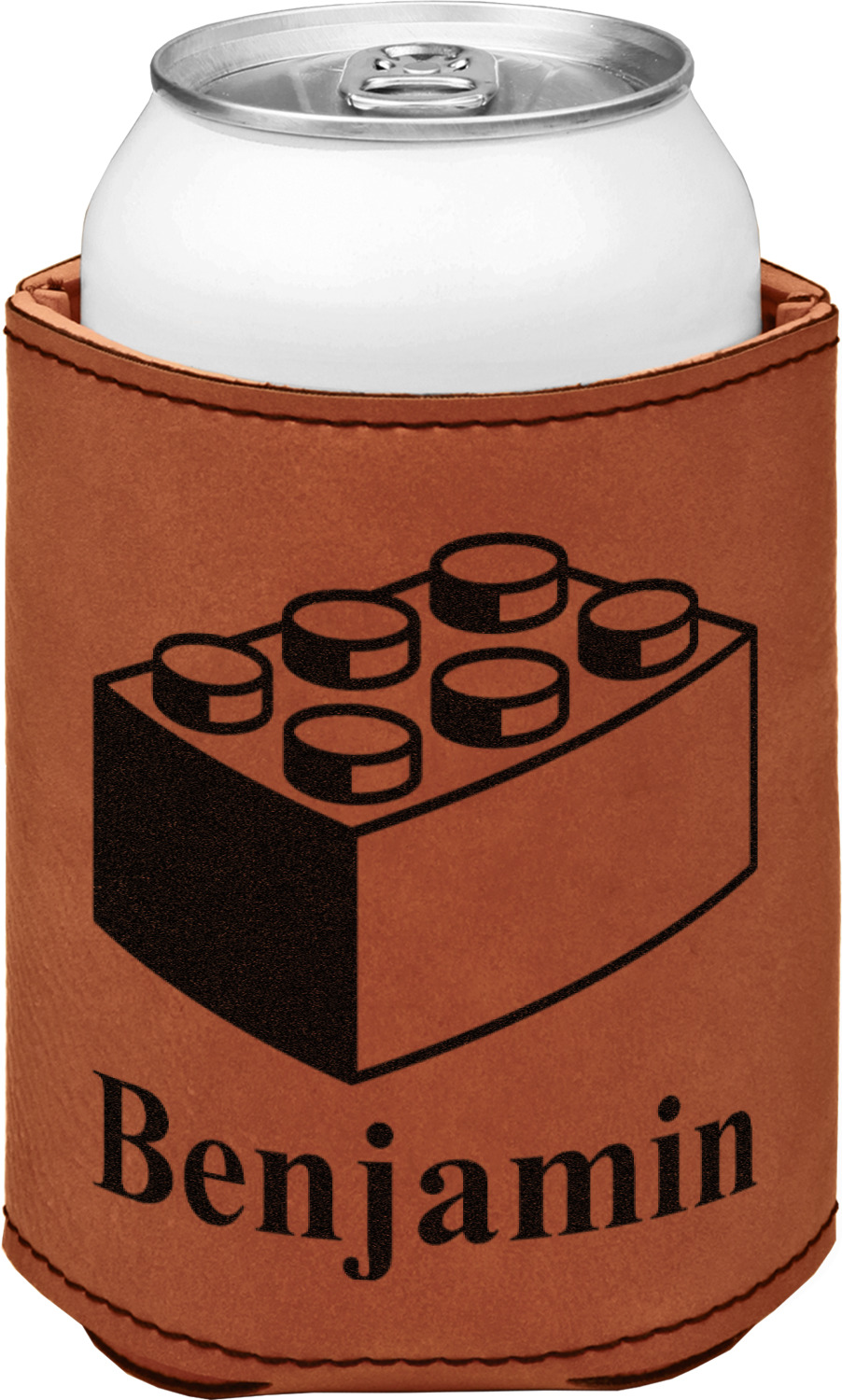 This can sleeve is made from a cognac-brown leatherette and stitched with a sturdy, black thread. A slim padding lines the inside of your can sleeve to allow for a better fit once your drink is inserted. The sleeve itself measures at 4 by 4.5 inches, allowing this custom can sleeve to accommodate most canned drinks. Your personalized design can be engraved on the front and back, or solely the front. When laser-engraved, your design appears as a black coloration which contrasts the leatherette nicely.