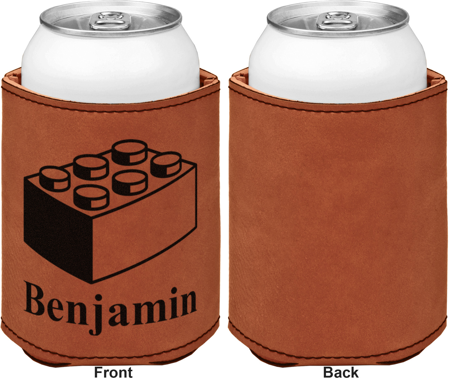 This can sleeve is made from a cognac-brown leatherette and stitched with a sturdy, black thread. A slim padding lines the inside of your can sleeve to allow for a better fit once your drink is inserted. The sleeve itself measures at 4 by 4.5 inches, allowing this custom can sleeve to accommodate most canned drinks. Your personalized design can be engraved on the front and back, or solely the front. When laser-engraved, your design appears as a black coloration which contrasts the leatherette nicely.