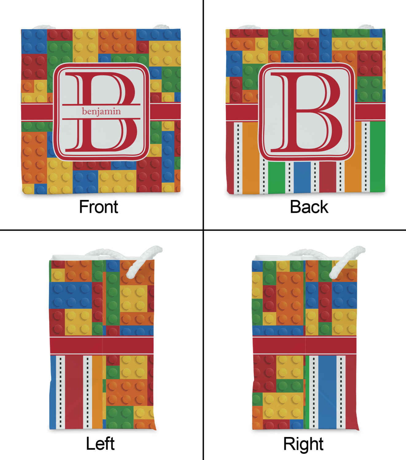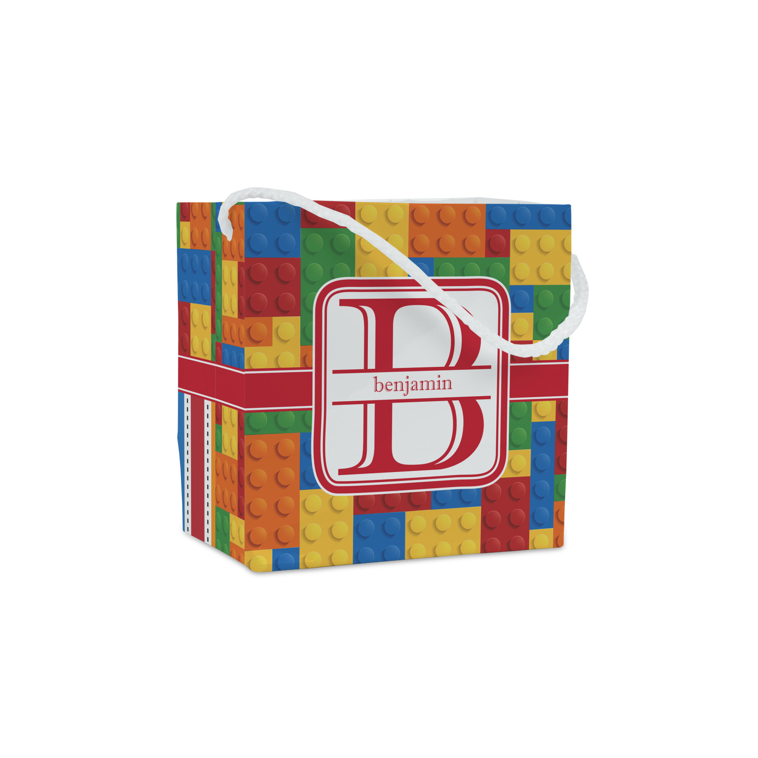 This building blocks design is made up of blocks of different shapes. sizes and colors all fitted together. We have featured a red ribbon along with square label and an initial and name for personalization.