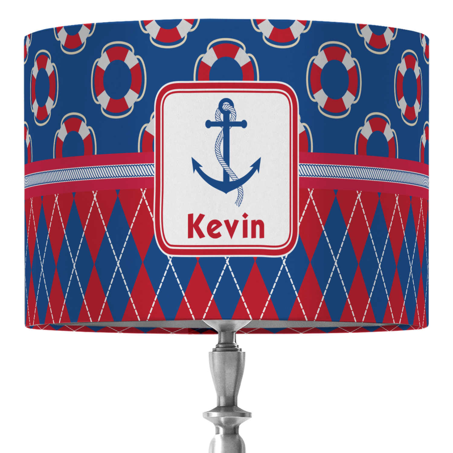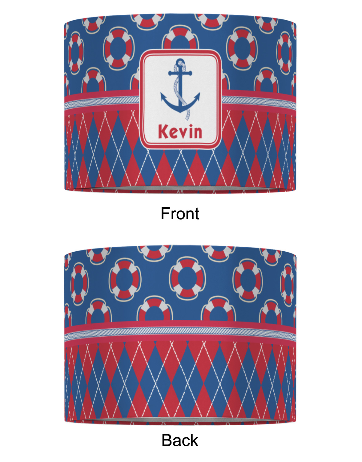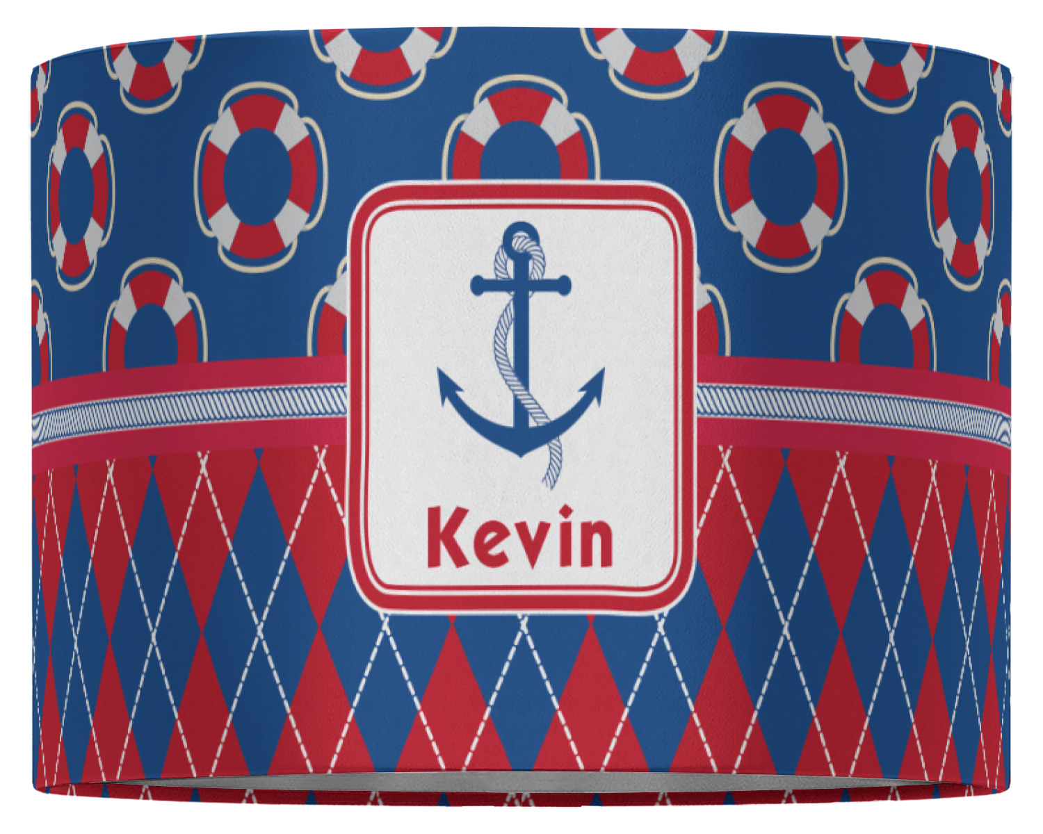 This look is just simply adorable. The life-saver design is nautical, fun, and yet still traditional. Using the classic colors of red, white, and blue these life-savers are floating leisurely in a backdrop of blue. The bottom of the design uses the coordinating colors in an argyle pattern for that timeless element in the pattern.