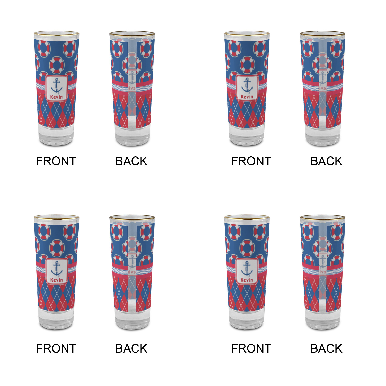 These glass shooter glasses are printed in full color with the design of your choice. These are a tall shooter 2 oz size and stand 4" tall. The print is a full wrap design to boldly display your personalization.