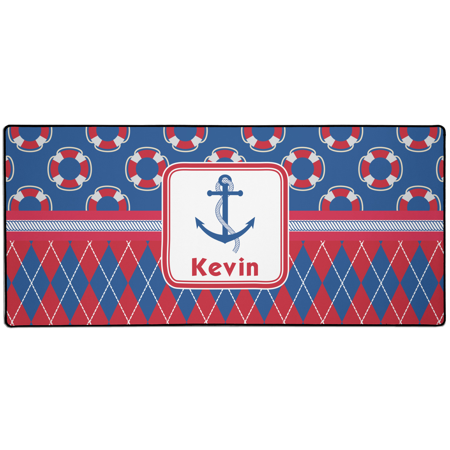 This look is just simply adorable. The life-saver design is nautical, fun, and yet still traditional. Using the classic colors of red, white, and blue these life-savers are floating leisurely in a backdrop of blue. The bottom of the design uses the coordinating colors in an argyle pattern for that timeless element in the pattern.