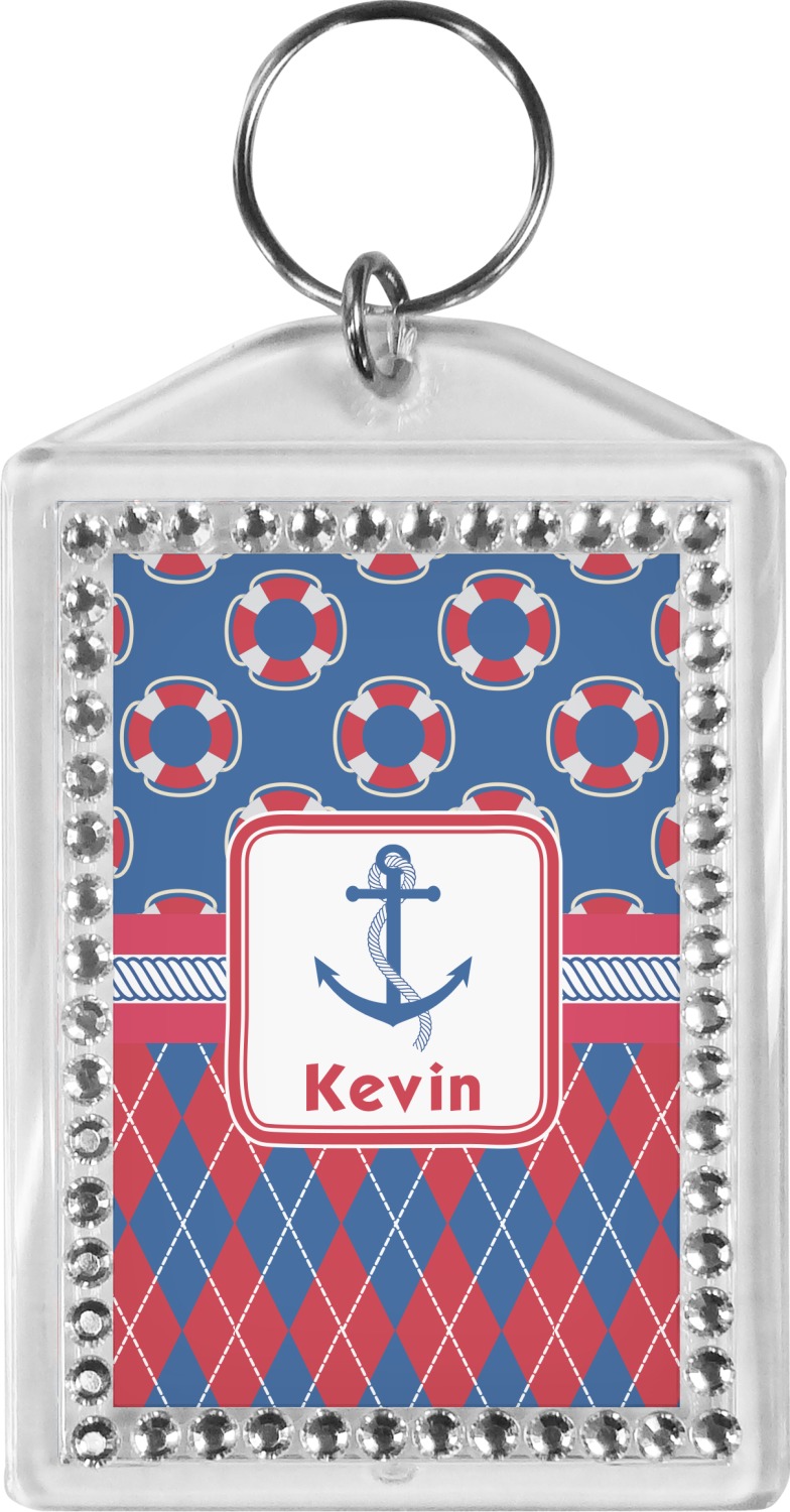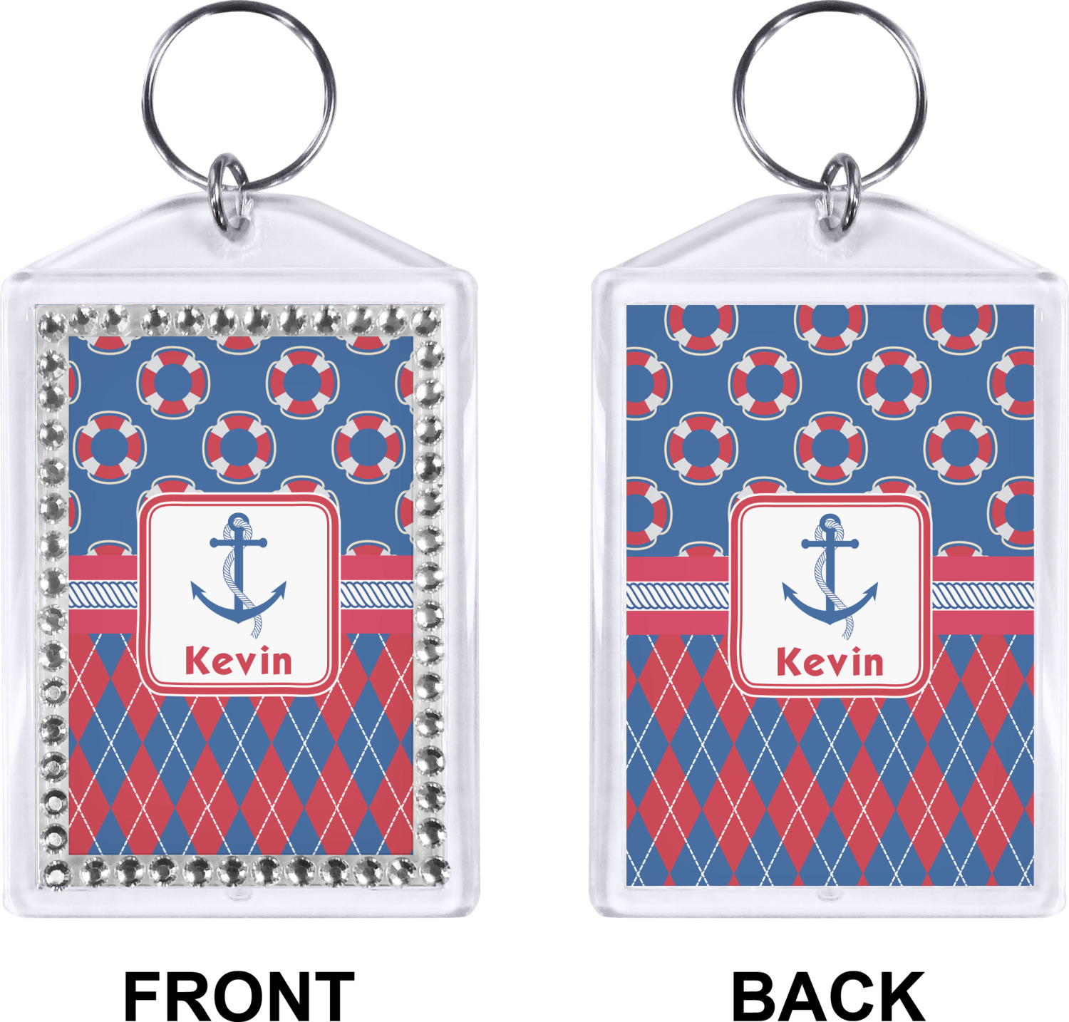 Our personalized keychains have a bold, rectangular shape, outlined by a series of shimmering rhinestones. A metal, split keyring is included with your purchase, and an additional metal hoop allows for attachment of the keychain to the split ring. This unique keychain measures at about 3.75 by 2.5 inches. We print your customized design(s) across both the back and front of this keychain.