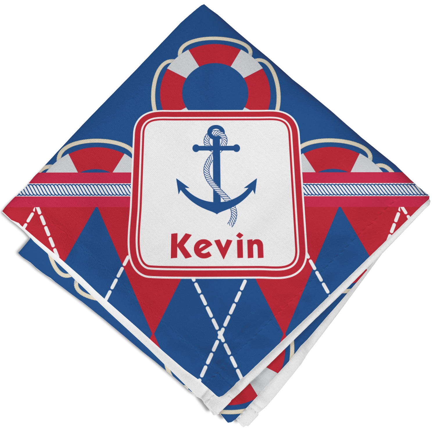 This look is just simply adorable. The life-saver design is nautical, fun, and yet still traditional. Using the classic colors of red, white, and blue these life-savers are floating leisurely in a backdrop of blue. The bottom of the design uses the coordinating colors in an argyle pattern for that timeless element in the pattern.