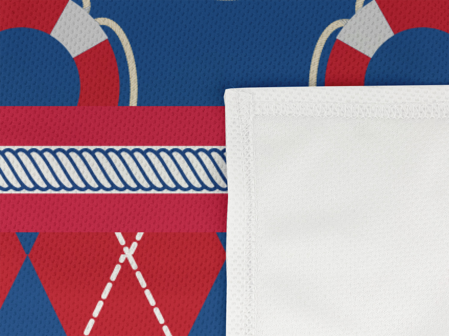 This look is just simply adorable. The life-saver design is nautical, fun, and yet still traditional. Using the classic colors of red, white, and blue these life-savers are floating leisurely in a backdrop of blue. The bottom of the design uses the coordinating colors in an argyle pattern for that timeless element in the pattern.