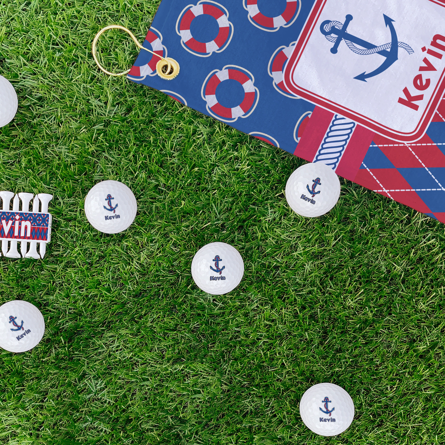 This look is just simply adorable. The life-saver design is nautical, fun, and yet still traditional. Using the classic colors of red, white, and blue these life-savers are floating leisurely in a backdrop of blue. The bottom of the design uses the coordinating colors in an argyle pattern for that timeless element in the pattern.