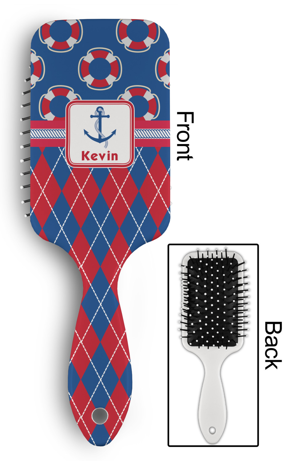 Your designed is printed on the front of the brush.; The back handle and sides are white.