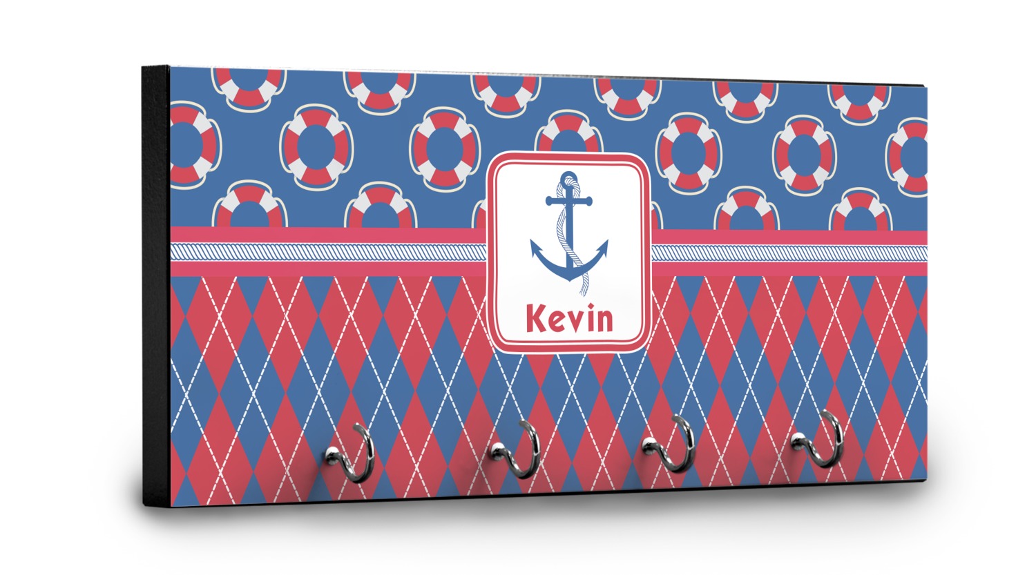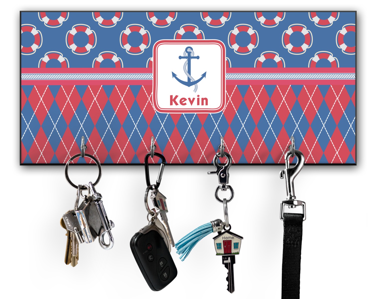 This 11" x 5" key hanger is made of sturdy wood and has four metal hooks lining the bottom. This is the perfect size for a family with several drivers. Not only can you hang keys on it though, but pet leashes and other small items. The board is black on the sides and back and is printed with the design of your choice on the front.