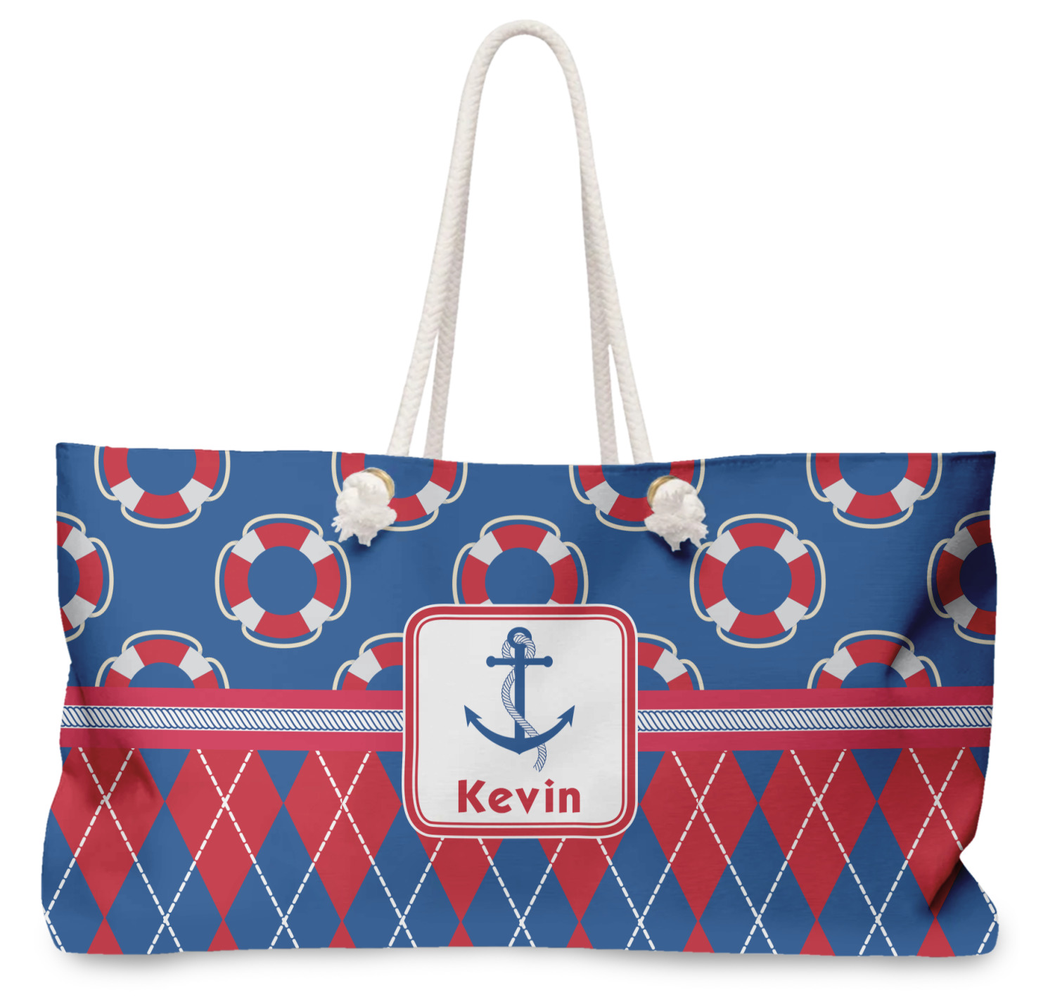 Our oversized weekender tote with rope handles is perfect for your weekend at the beach or on the town. This large tote are 24" W X 13" H, with a 5" gusset and a 27" thick rope handles with a knot that is put through a grommeted brass hole.