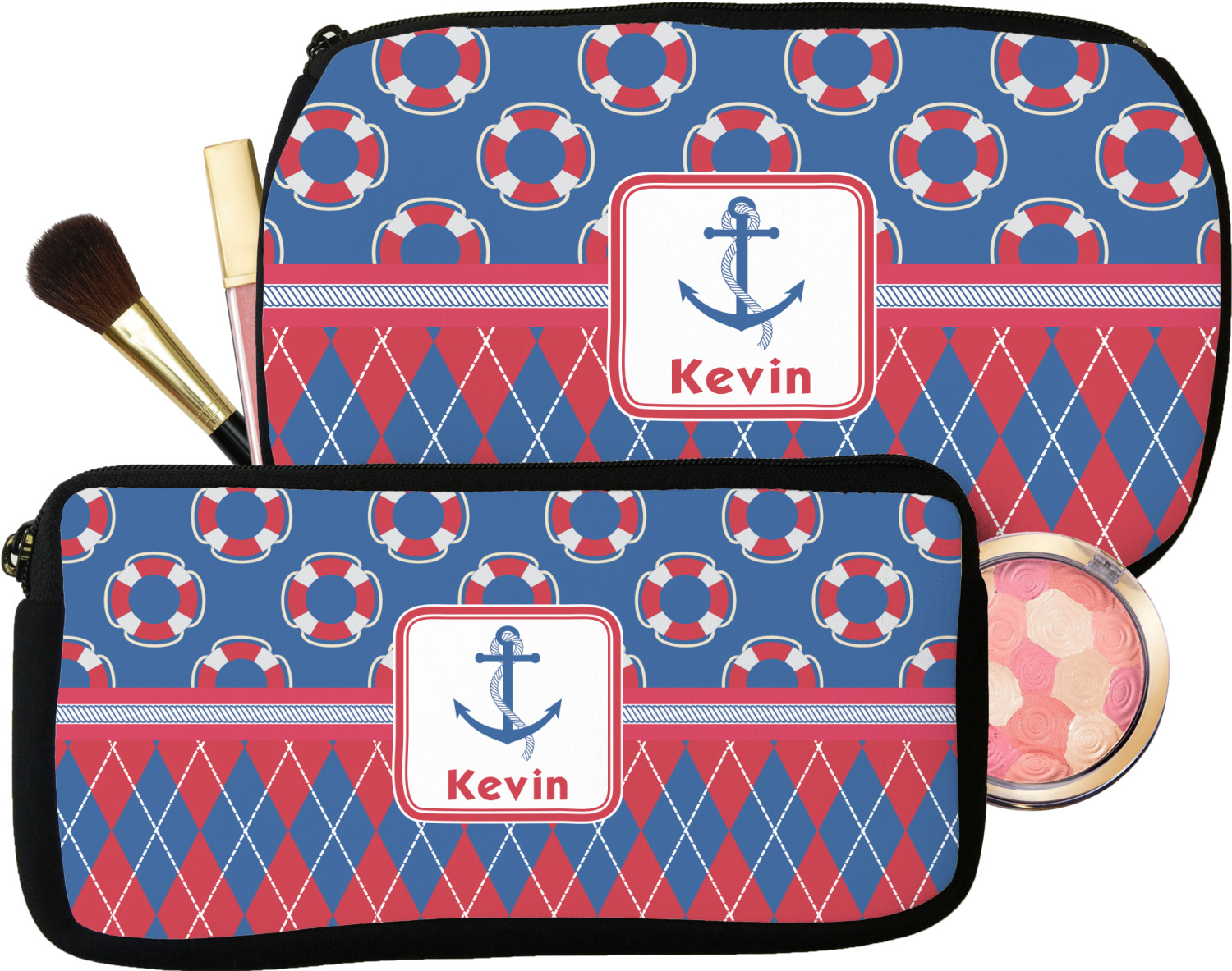 Our personalized makeup bags are available in many different designs, patterns and colors - so you are sure to find one that will love. They are made of neoprene (same material as wet-suits) and thus are water resistant, so spillages in your makeup bag will not end up all over you purse. They are customized on one side and are black on the other side and the zipper is black as well.