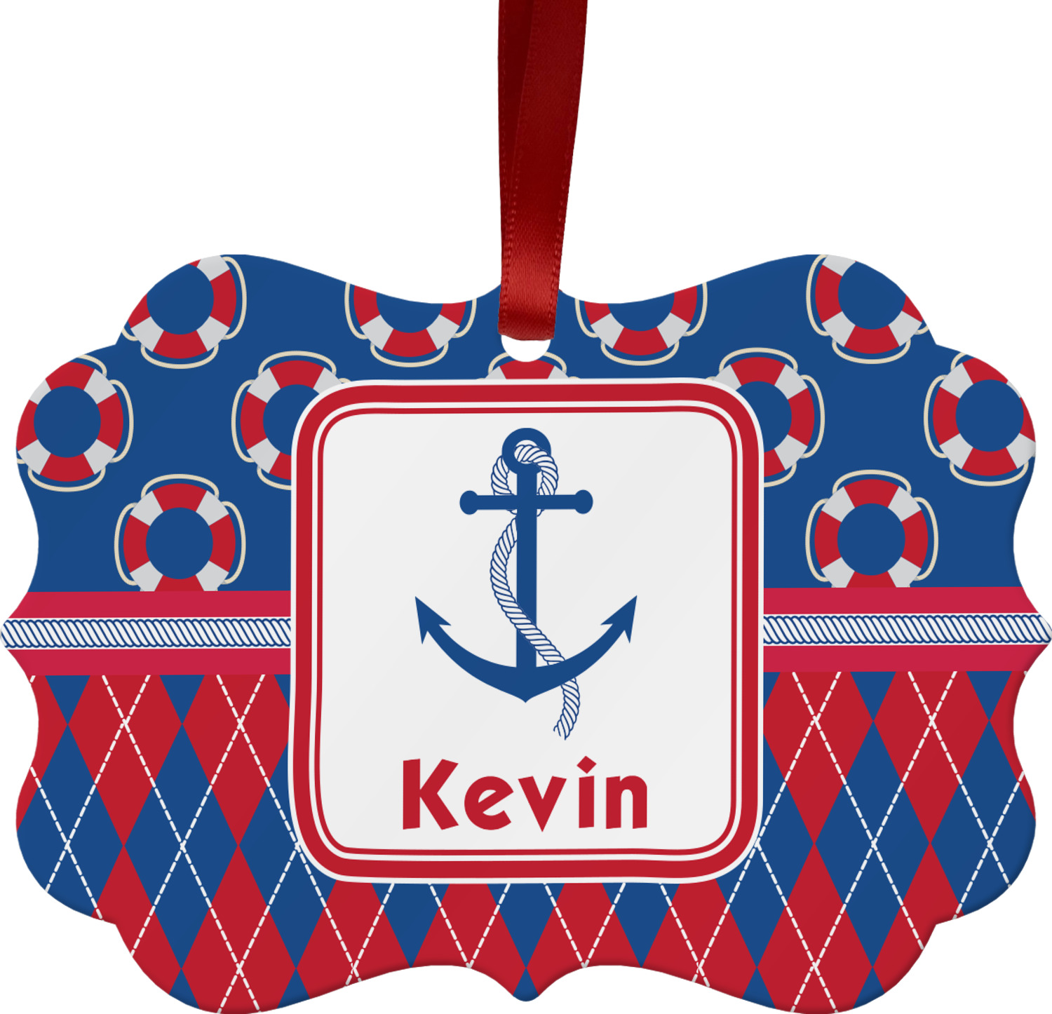 This look is just simply adorable. The life-saver design is nautical, fun, and yet still traditional. Using the classic colors of red, white, and blue these life-savers are floating leisurely in a backdrop of blue. The bottom of the design uses the coordinating colors in an argyle pattern for that timeless element in the pattern.