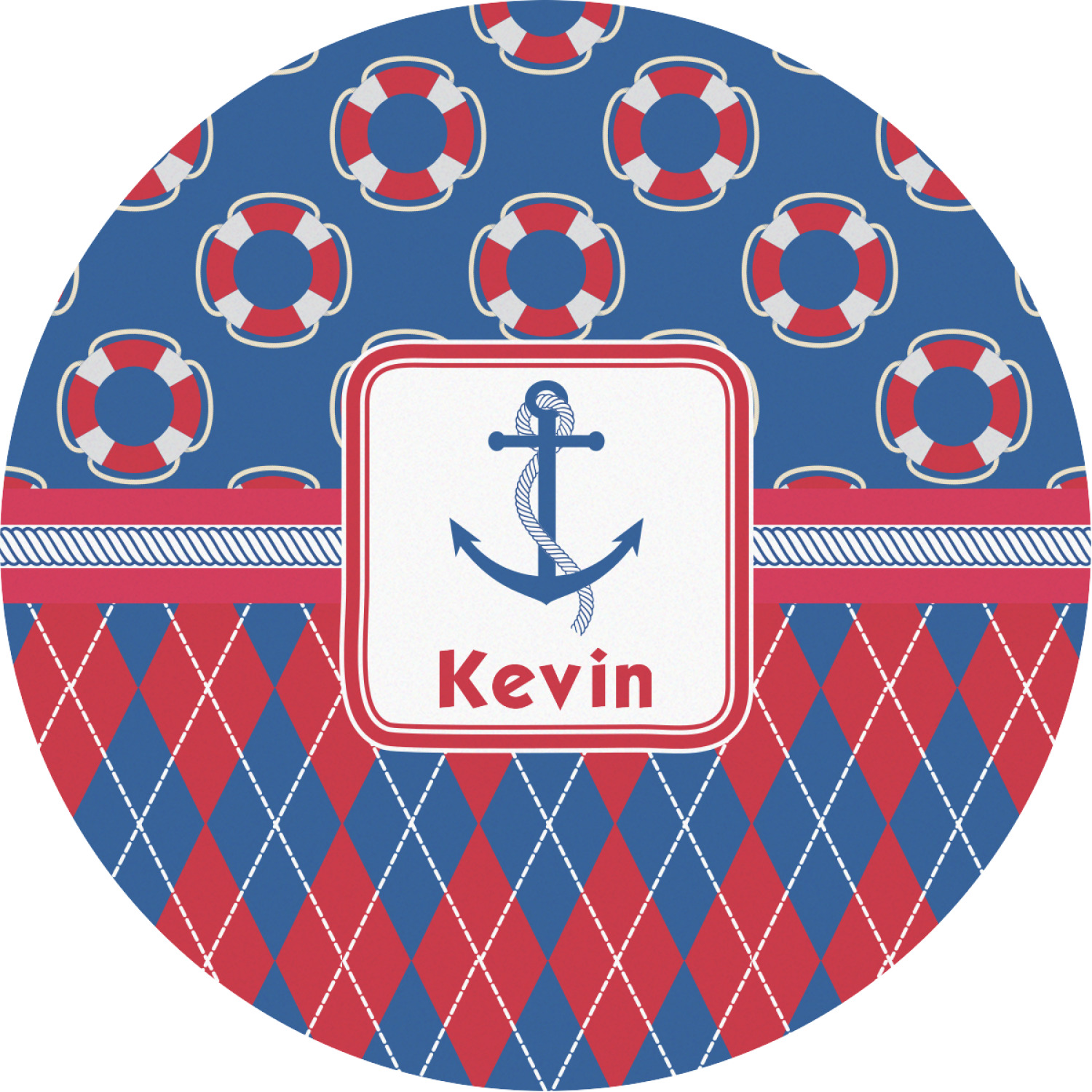 This look is just simply adorable. The life-saver design is nautical, fun, and yet still traditional. Using the classic colors of red, white, and blue these life-savers are floating leisurely in a backdrop of blue. The bottom of the design uses the coordinating colors in an argyle pattern for that timeless element in the pattern.