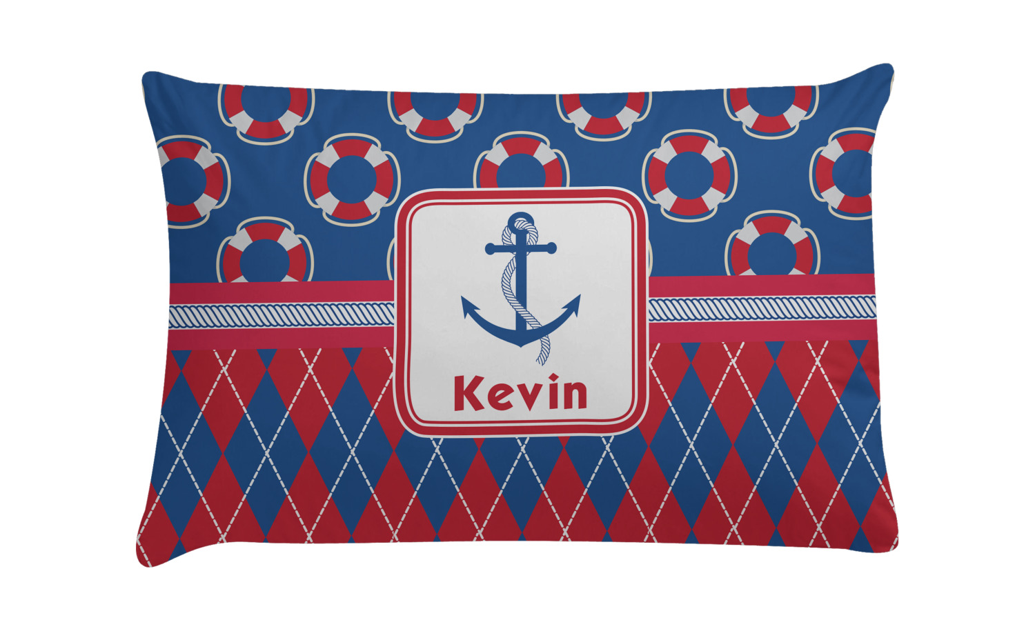 This look is just simply adorable. The life-saver design is nautical, fun, and yet still traditional. Using the classic colors of red, white, and blue these life-savers are floating leisurely in a backdrop of blue. The bottom of the design uses the coordinating colors in an argyle pattern for that timeless element in the pattern.