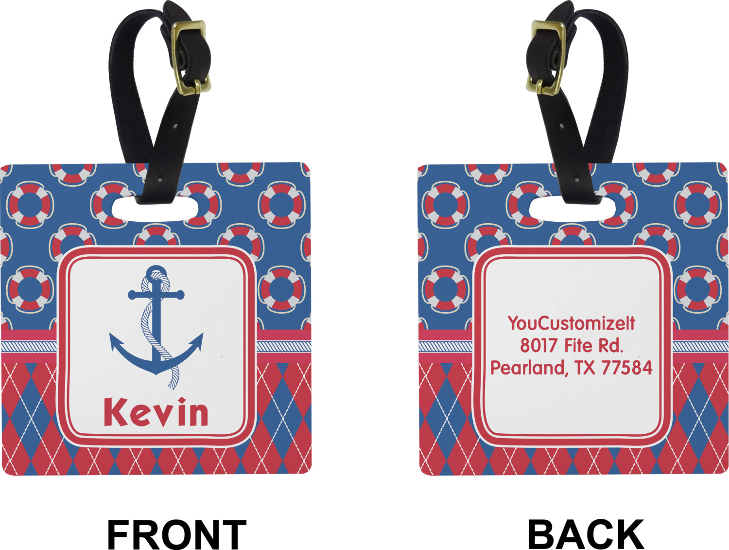 These personalized bag tags are sold in a variety of shapes, so that you may find the product that meets your vision exactly. We sell a round luggage tag, which measures at approximately 4" x 4". Our square luggage tag is about 3.5" x 3.5", while our rectangular version is 2.75" x 4 ".