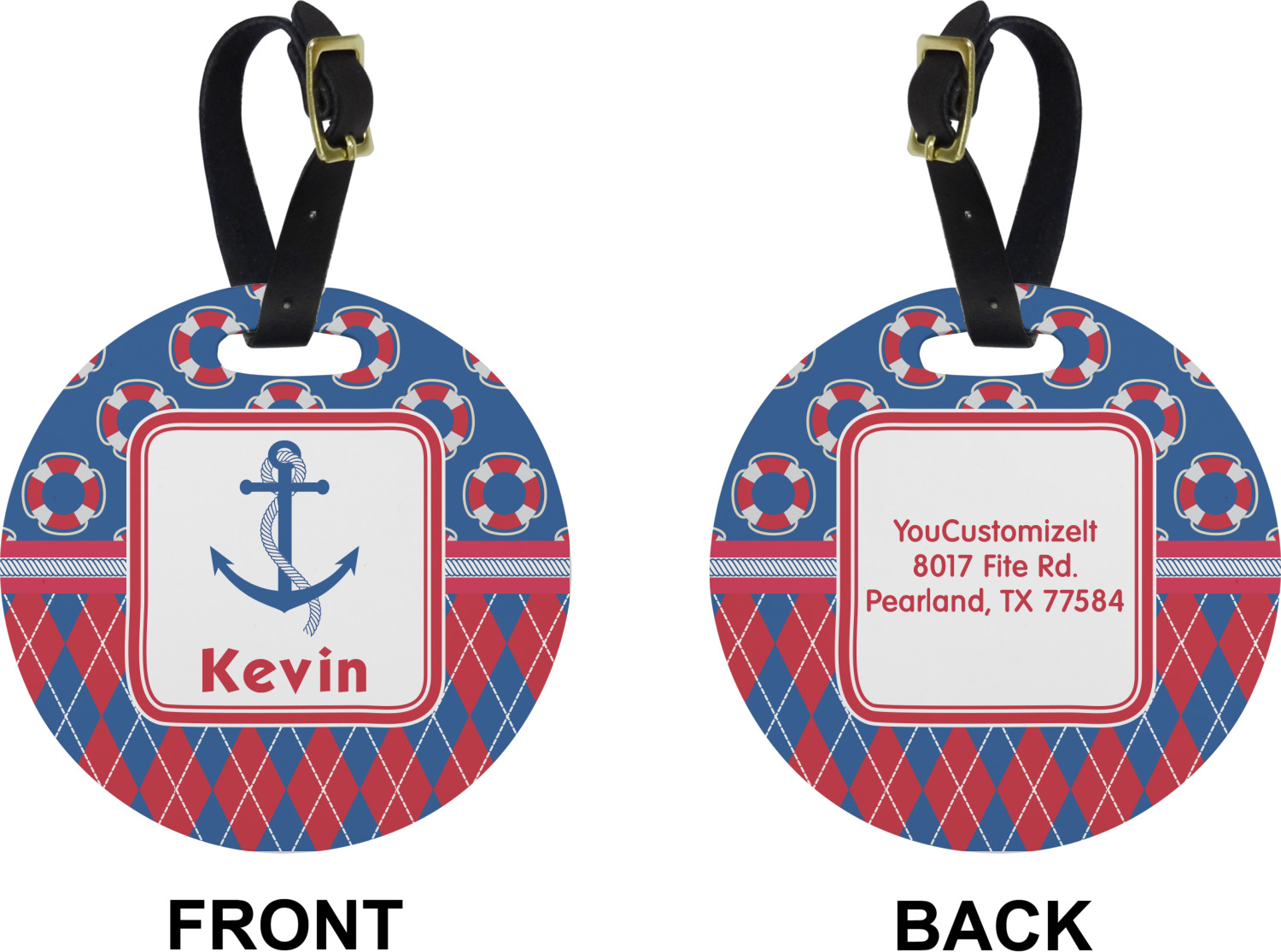 These personalized bag tags are sold in a variety of shapes, so that you may find the product that meets your vision exactly. We sell a round luggage tag, which measures at approximately 4" x 4". Our square luggage tag is about 3.5" x 3.5", while our rectangular version is 2.75" x 4 ".