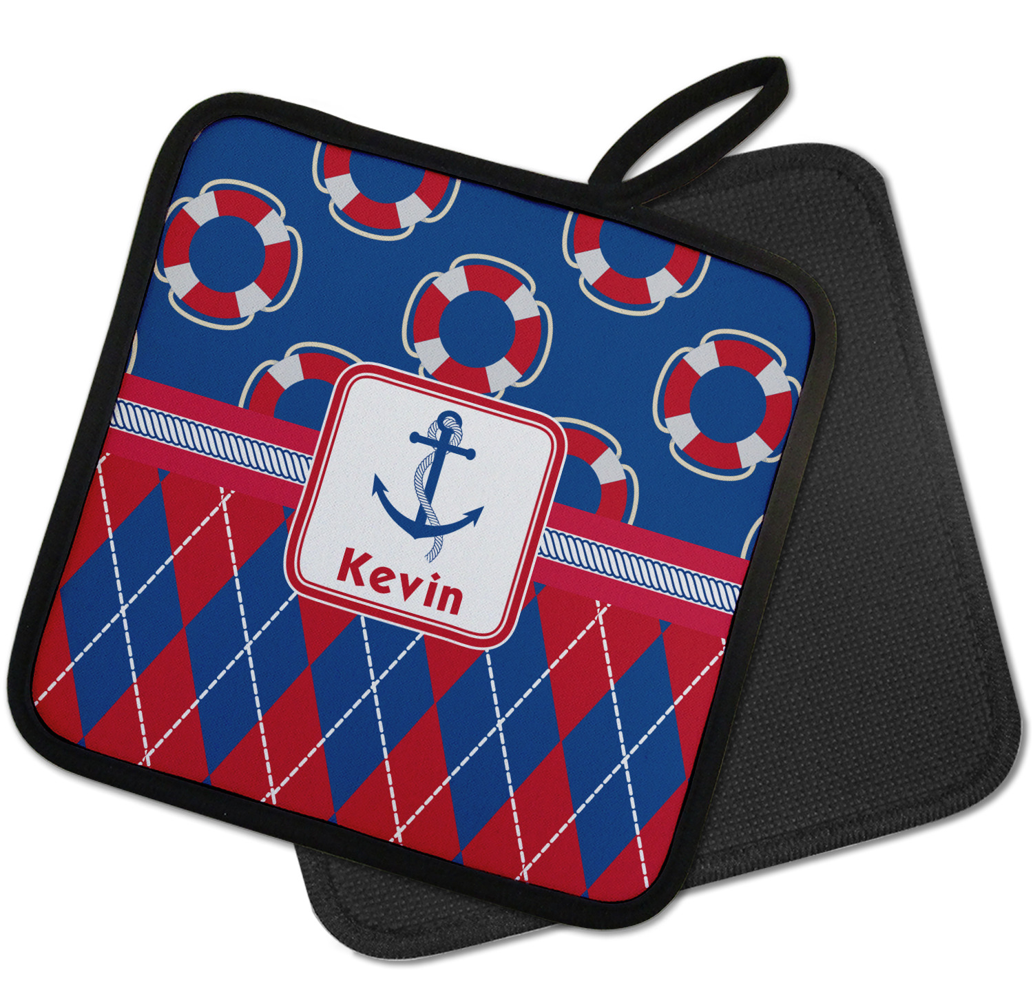 Our personalized pot holders feature a neoprene front that displays your personalization in vibrant colors. The backing of the hot pot holder is rubberized; the textured backing allows you to have a great grip when using this custom pot holder. The two materials are joined with a sleek, black trim, and the holder also includes an attached loop for hanging and storage. The pot holder is approximately 8.75 inches by 8.75 inches and 0.25 inches tall, while the fabric loop is 2.5 inches long. You can purchase a kitchen pot holder by itself or as a set of 2. We also offer a set including one pot holder and one oven mitt.