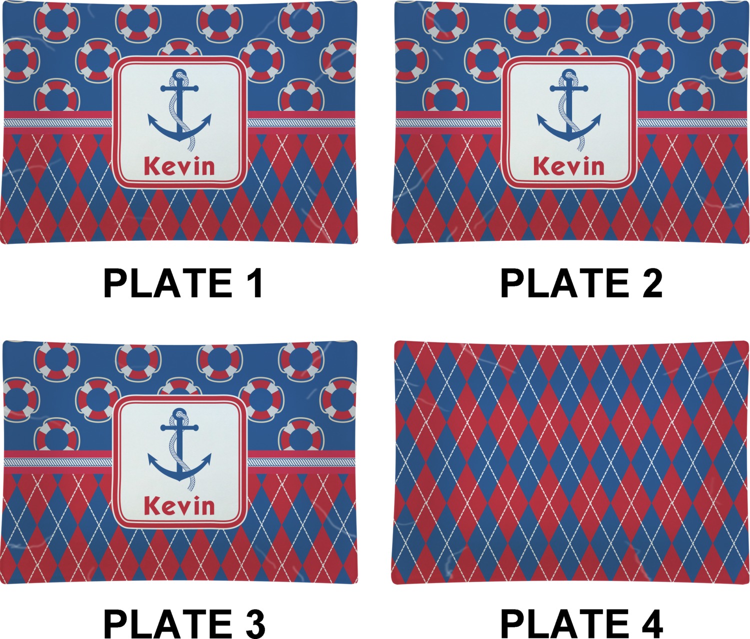 This look is just simply adorable. The life-saver design is nautical, fun, and yet still traditional. Using the classic colors of red, white, and blue these life-savers are floating leisurely in a backdrop of blue. The bottom of the design uses the coordinating colors in an argyle pattern for that timeless element in the pattern.