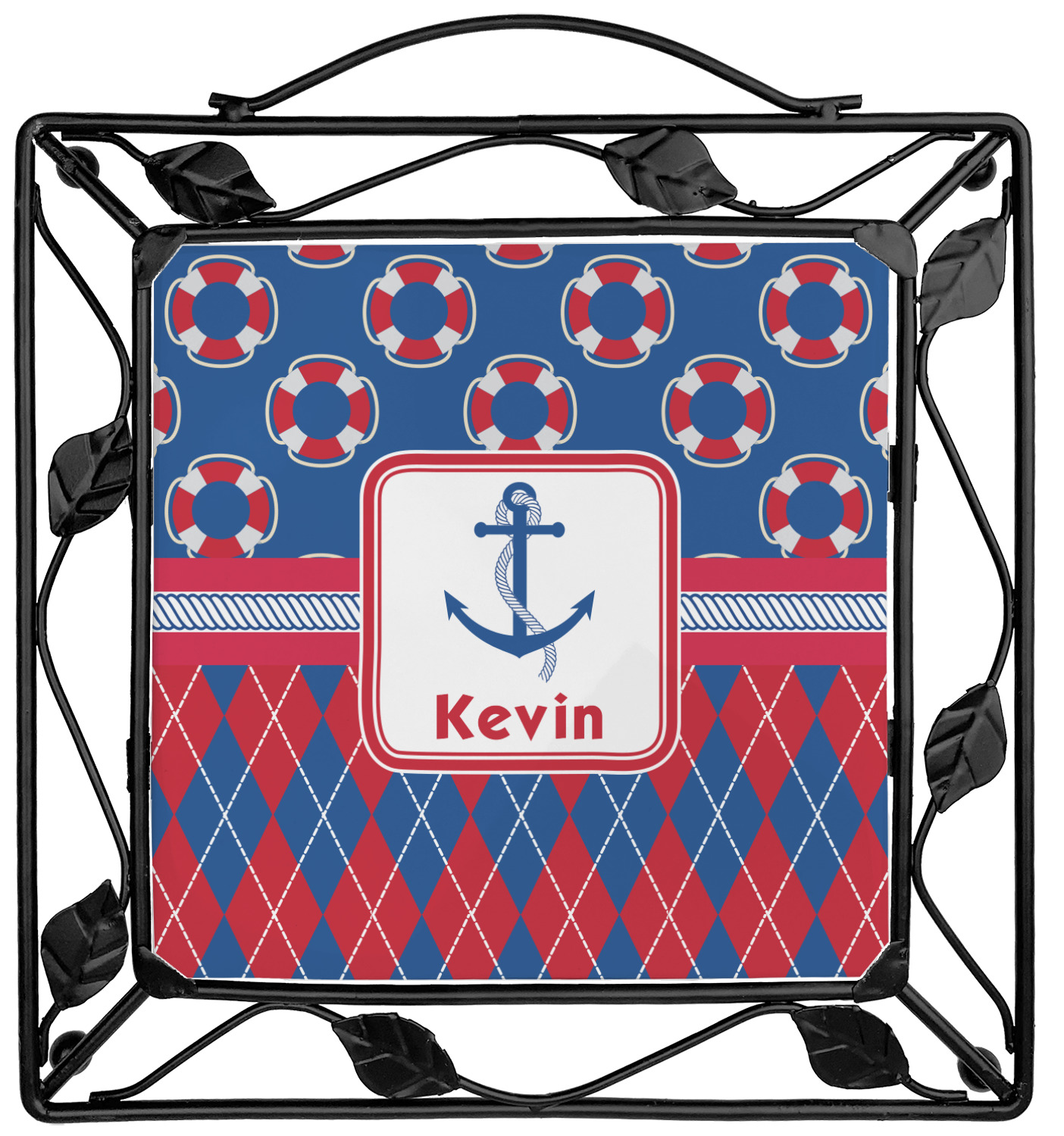 Our square trivets are made from a durable, wrought iron. This model features 4 small half circles, one on each corner, and a larger ring of iron that circles the central, customized tile. Each of the 4 corners has a round foot on its bottom for stability. This trivet is 8.75 by 8.75 inches, but the central tile measures at 6 inches on both sides.