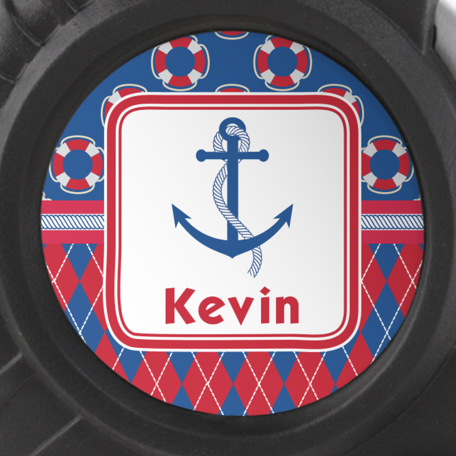This look is just simply adorable. The life-saver design is nautical, fun, and yet still traditional. Using the classic colors of red, white, and blue these life-savers are floating leisurely in a backdrop of blue. The bottom of the design uses the coordinating colors in an argyle pattern for that timeless element in the pattern.