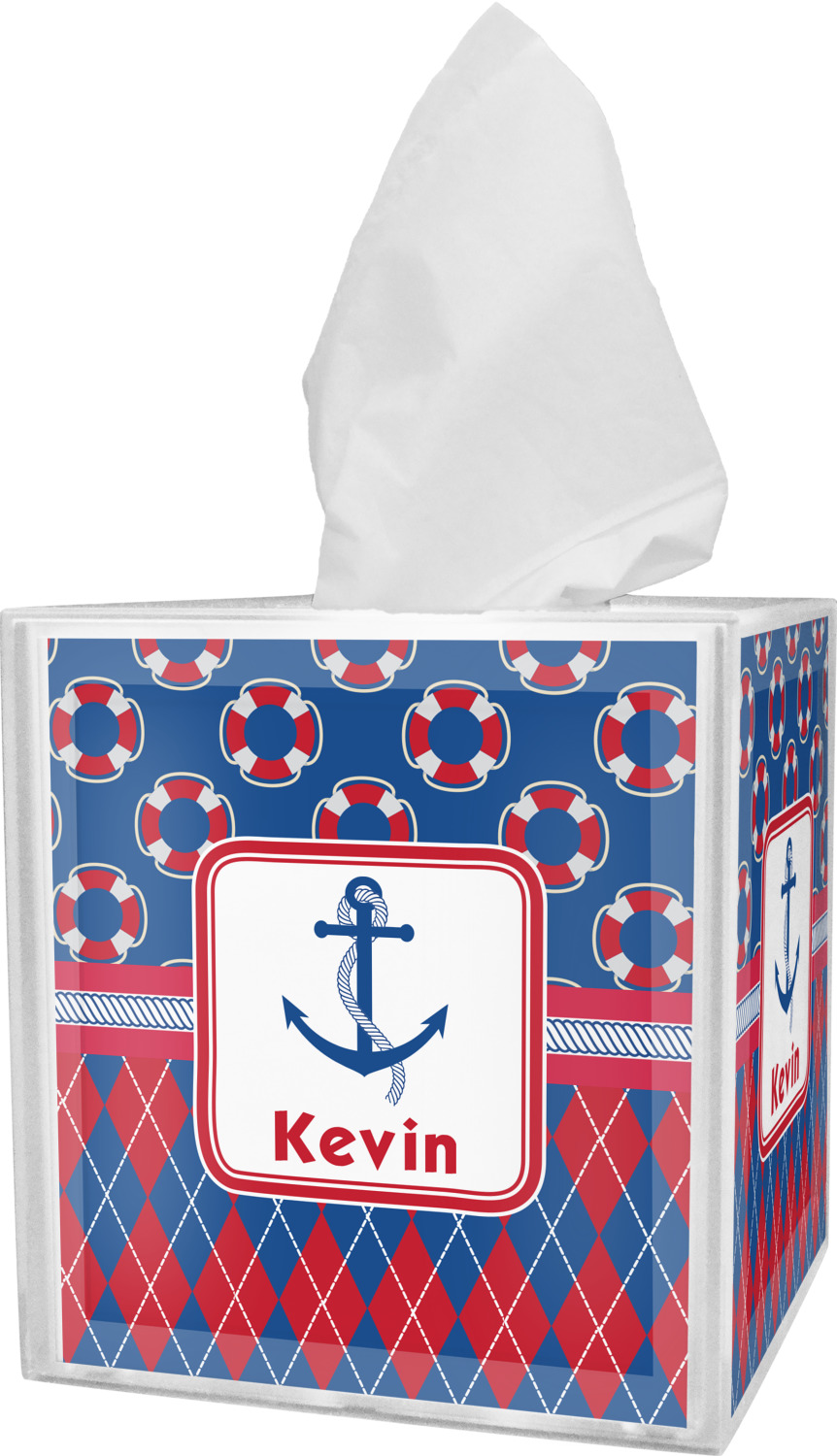 These tissue holders are built from durable acrylic and display your unique personalization on fine-quality vinyl inserts placed within the four sides and top. The box features two pieces, allowing you to easily switch out tissue boxes. On the sides, youll find ridges that ensure the top and base fit securely in place. The bottom of these tissue box holders has four, rubber, non-slip pads to prevent the box from scuffing any surface you decide to display it on. Each box can fit a standard 5 by 5-inch box of tissues.