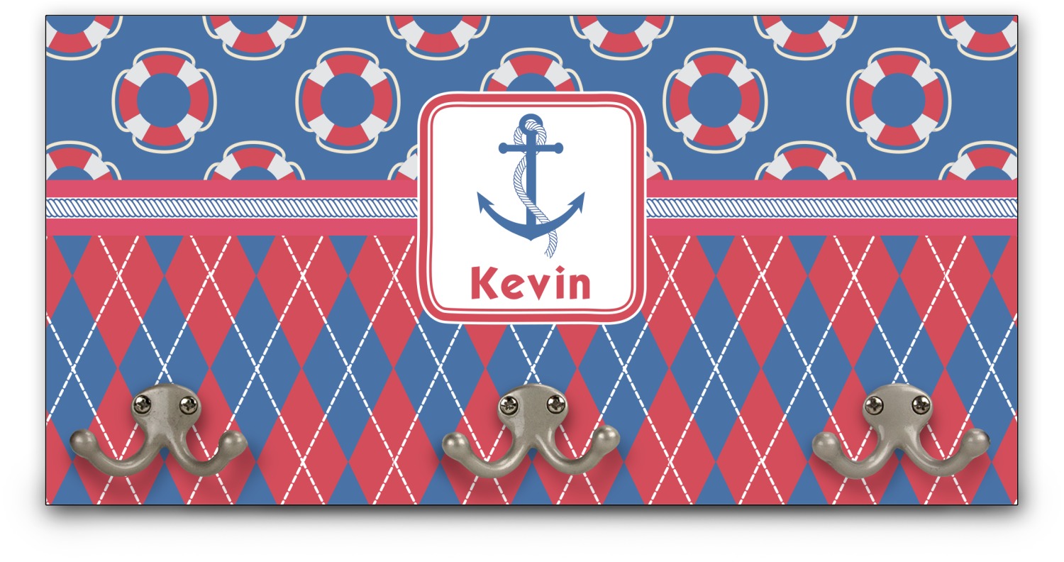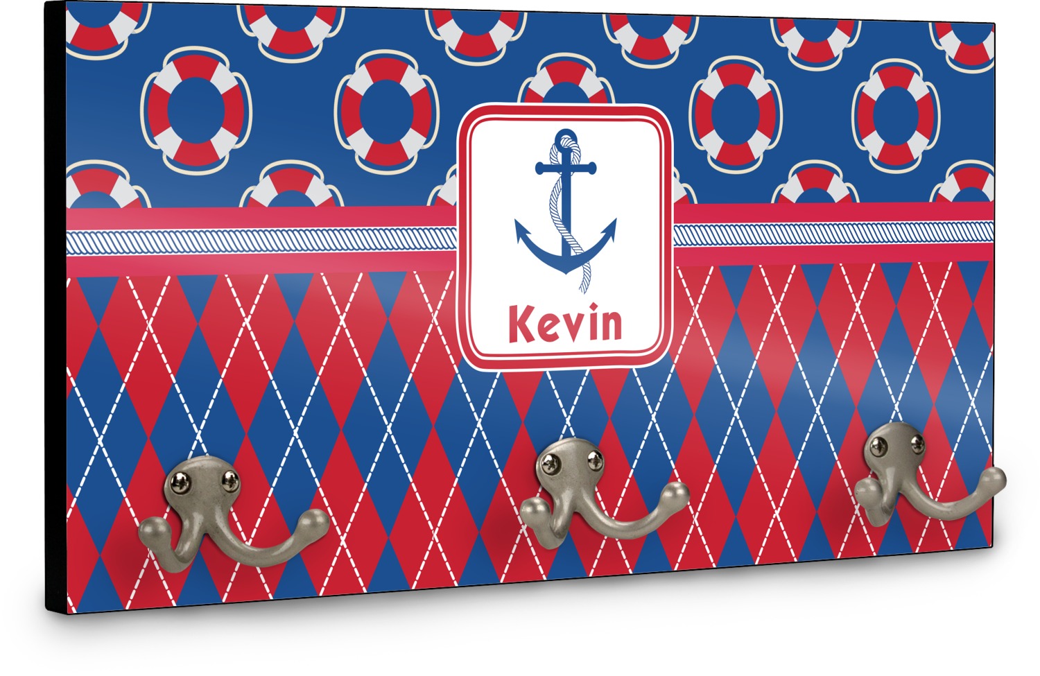 This coat rack is the perfect way to add some personality to your wall or entryway. The board is made of a strong maple that is approximately 16" x 8". The three 2-prong hooks are a sturdy metal that have three screws attaching them to the board. Your design is printed right onto the front of the board while the back and sides are a simple black.