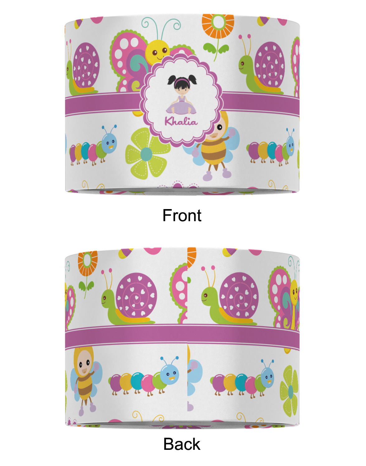 A wide band of purple with an inset of white pull the pattern together. A sweet little girl sits in the center of a purple trimmed scalloped white circle. Add personalization for that custom touch.