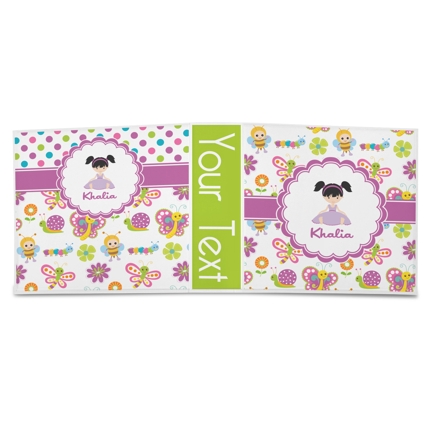 A wide band of purple with an inset of white pull the pattern together. A sweet little girl sits in the center of a purple trimmed scalloped white circle. Add personalization for that custom touch.