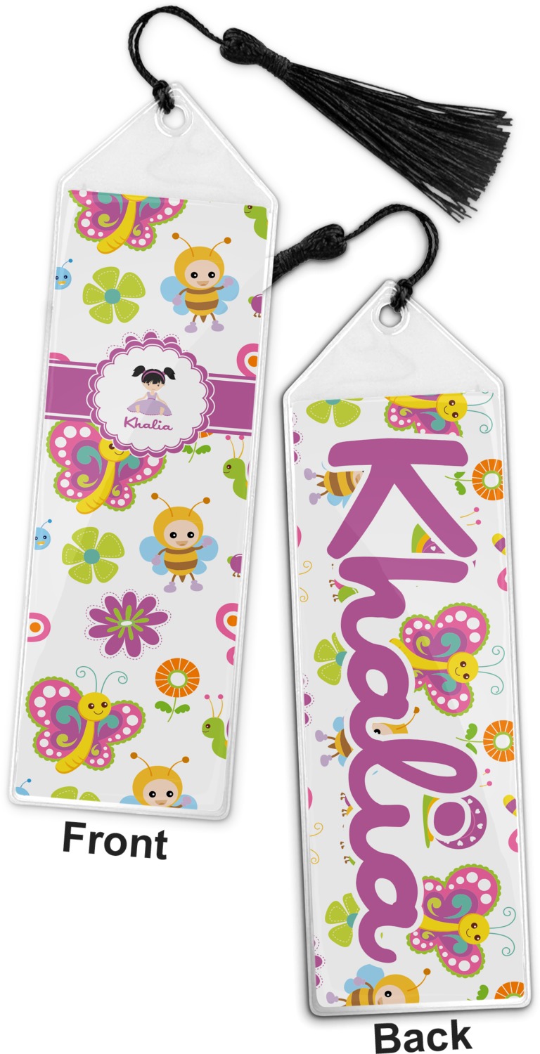 Your personalized bookmark is made of a sturdy, clear vinyl, and is approximately 7.5" x 2.25". We display your personalization on vinyl inserts that are placed on both sides. Accompanying each book marker is a black, fringe tassel that attaches to the reinforced, triangular header.