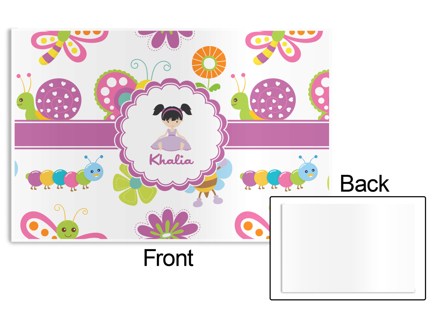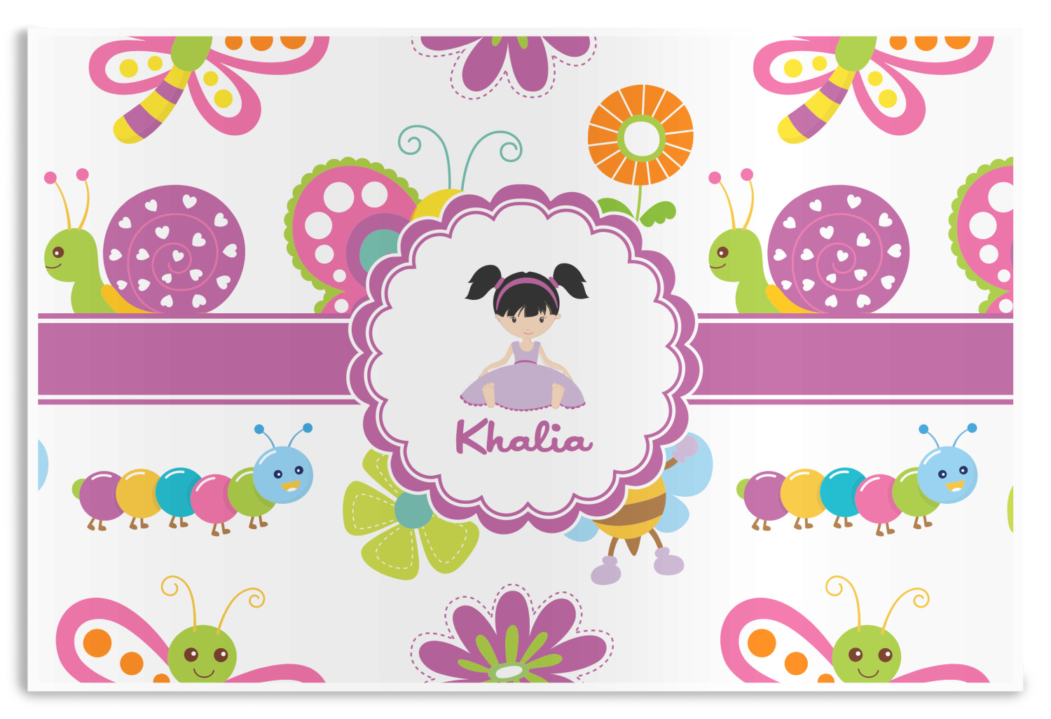 A wide band of purple with an inset of white pull the pattern together. A sweet little girl sits in the center of a purple trimmed scalloped white circle. Add personalization for that custom touch.