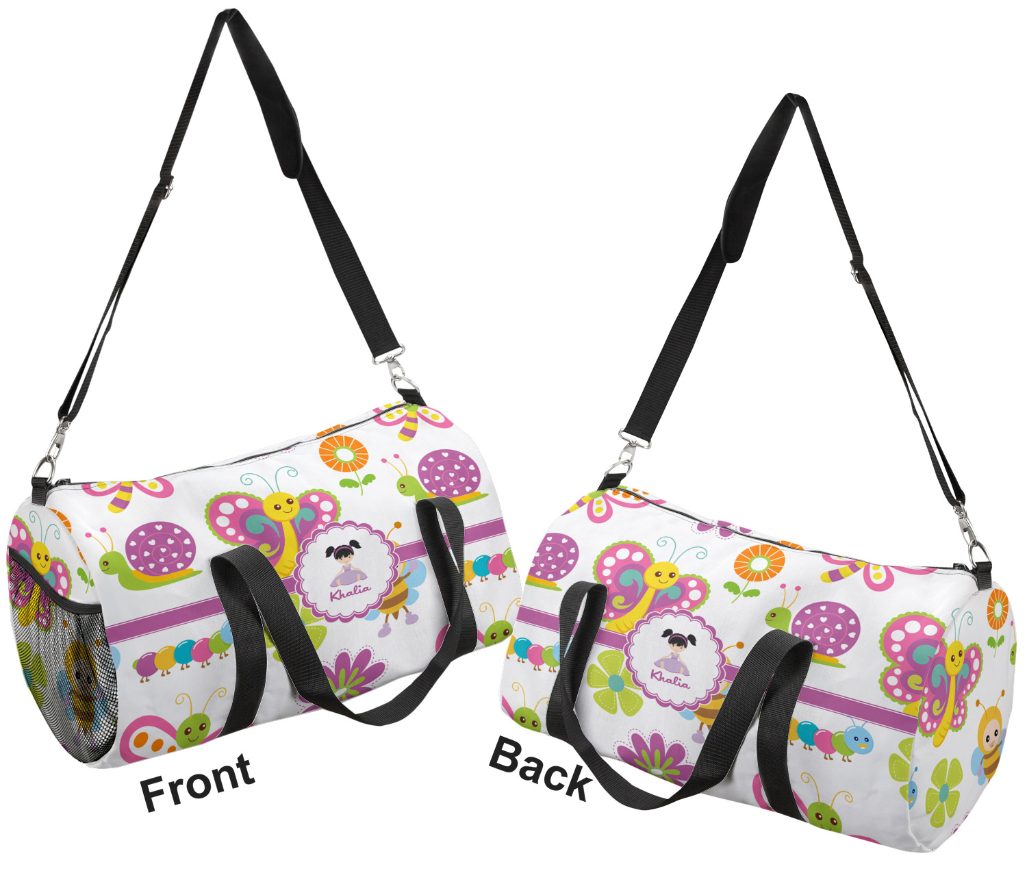 This duffle is a sturdy bag made of a canvas material. It comes in two sizes: Small (19"W x 9.5"H x 9.5"D) and Large (23"W x 12"H x 12"D). The bag is a cylindrical shape with a black adjustable strap and two handles. On one side is an elastic pouch to put a waterbottle or other small item. Your product will be sublimated with your design and is able to be designed on the front, back, and sides. Be sure to remember that the straps may cut into parts of your design if you upload your own artwork.