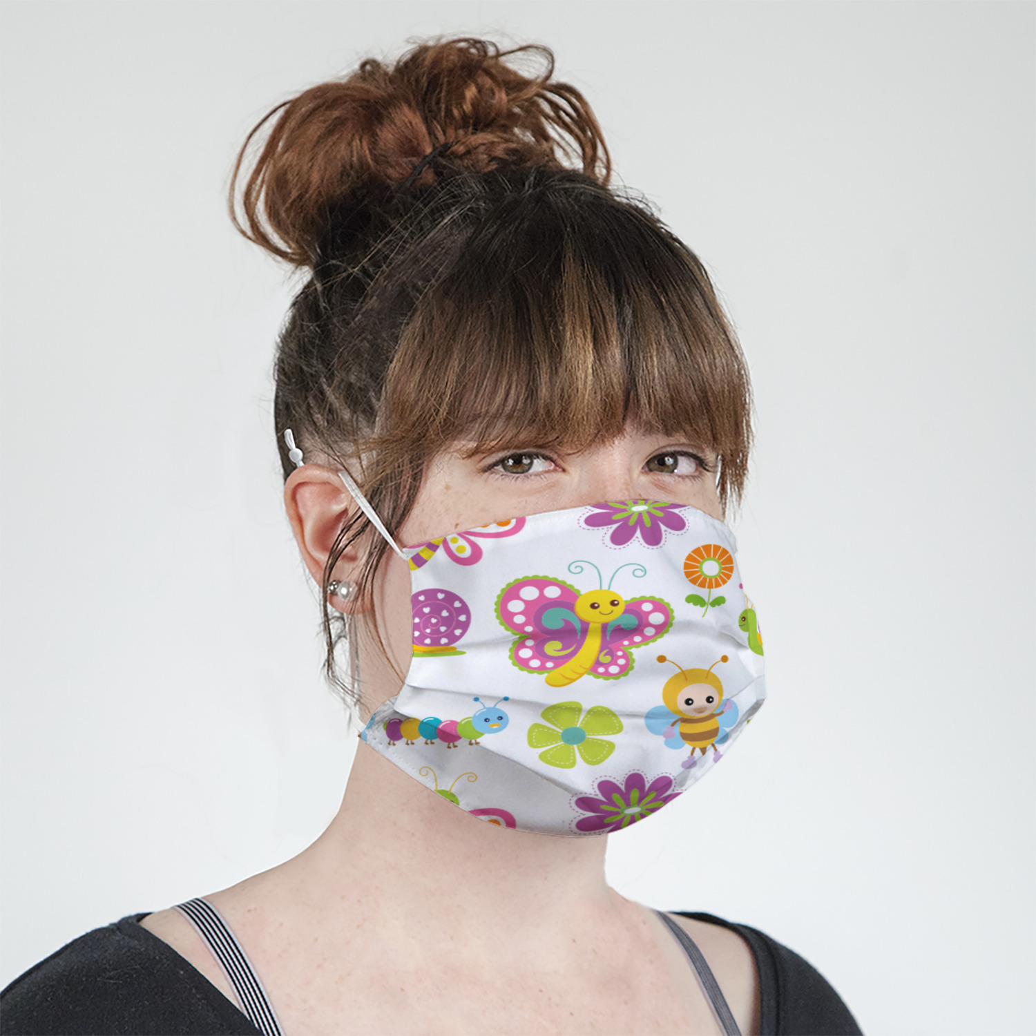 These fun face masks are 7" wide and 3.5" high. They feature pleats, adjustable ear loops, and are made with two layers of fabric. The top layer where your design is printed is a breathable polyester sheeting, while the inside layer is a soft microfiber polyester