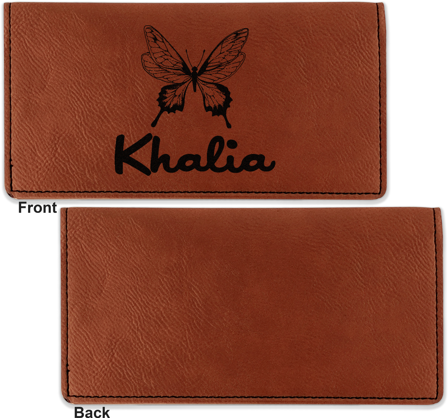 Go into our design center to start personalizing. Your checkbook cover will be laser engraved, making the graphic or text a black color. Choose a fun saying, monogram, or font to go on your checkbook cover. You have the opportunity to do it double or single sided.