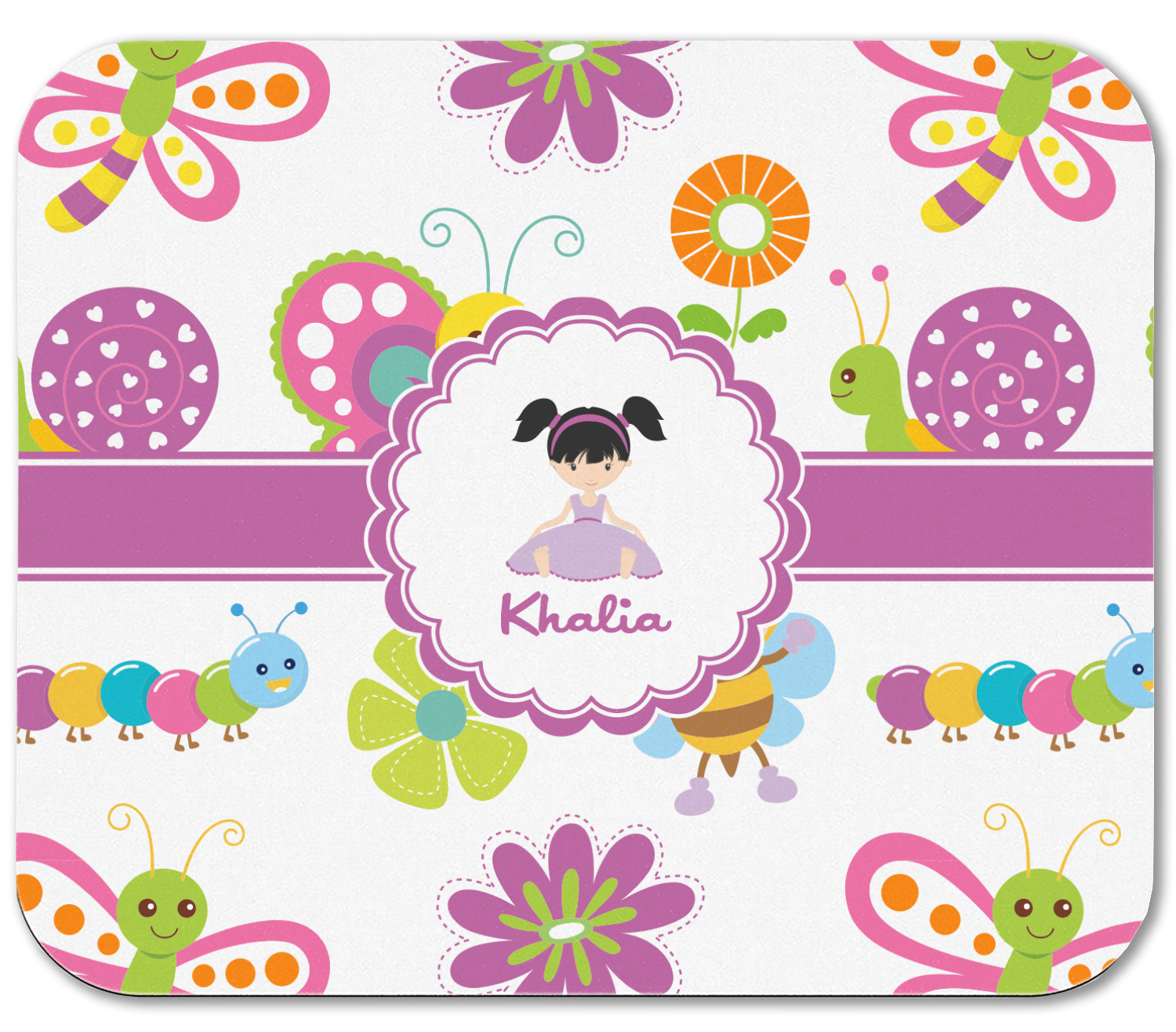 A wide band of purple with an inset of white pull the pattern together. A sweet little girl sits in the center of a purple trimmed scalloped white circle. Add personalization for that custom touch.