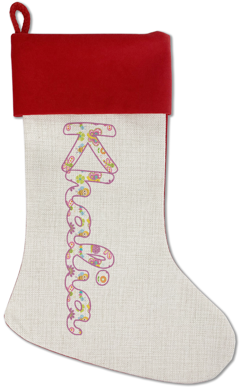Our classic red stockings are made from a soft, yet durable polyester material perfect for any stocking stuffer! The front of our Christmas stockings have a linen front that boldly displays your custom design accented with a lush red cuff resting all around the stocking. Each stocking is approximately 18x12 with a durable cotton rope loop for hanging.