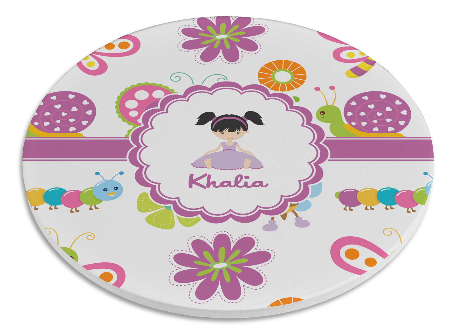 A wide band of purple with an inset of white pull the pattern together. A sweet little girl sits in the center of a purple trimmed scalloped white circle. Add personalization for that custom touch.
