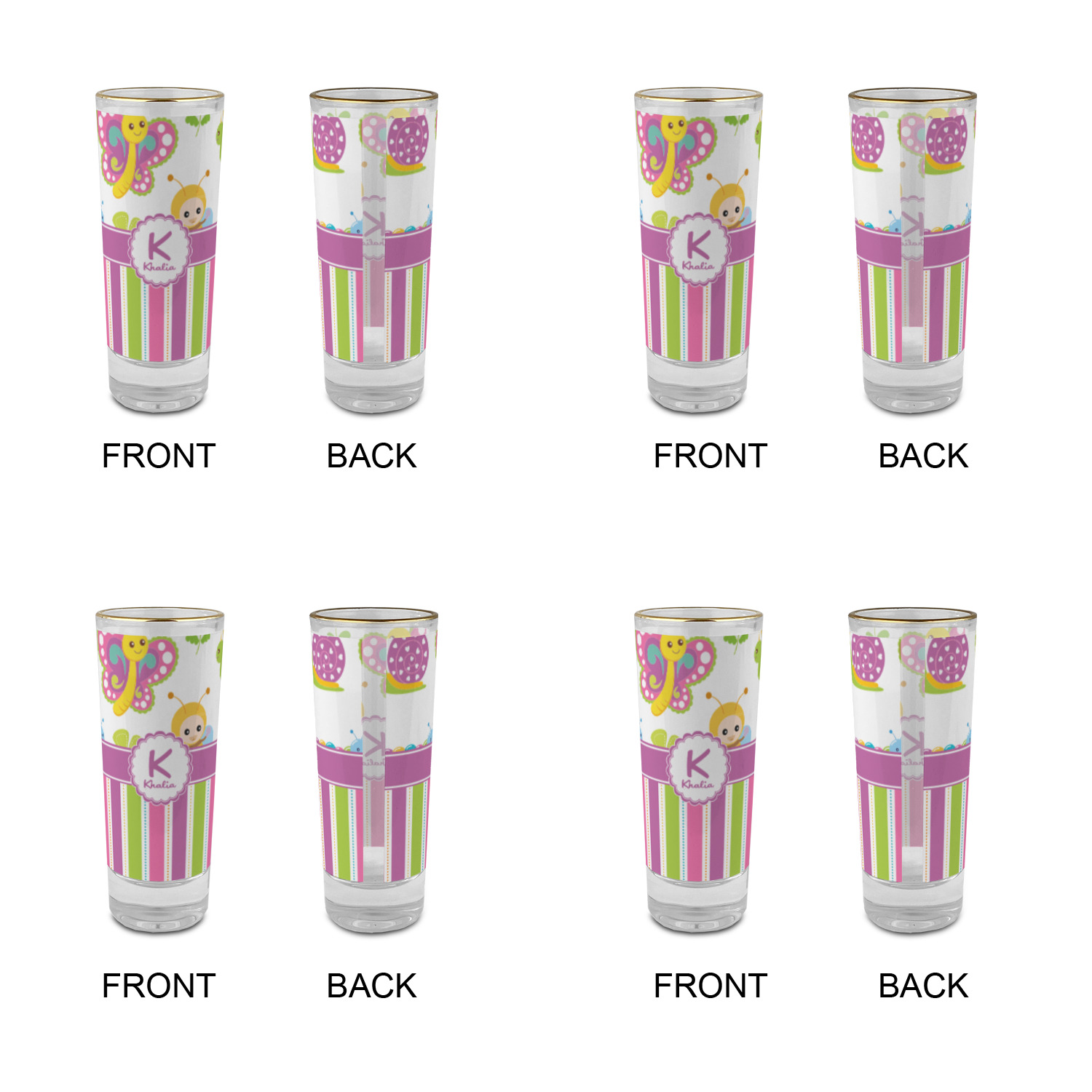 These glass shooter glasses are printed in full color with the design of your choice. These are a tall shooter 2 oz size and stand 4" tall. The print is a full wrap design to boldly display your personalization.