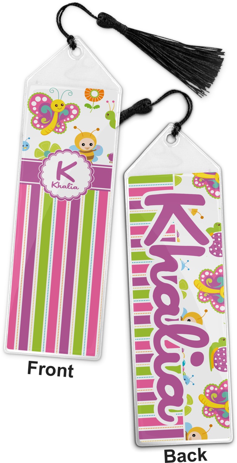 Your personalized bookmark is made of a sturdy, clear vinyl, and is approximately 7.5" x 2.25". We display your personalization on vinyl inserts that are placed on both sides. Accompanying each book marker is a black, fringe tassel that attaches to the reinforced, triangular header.