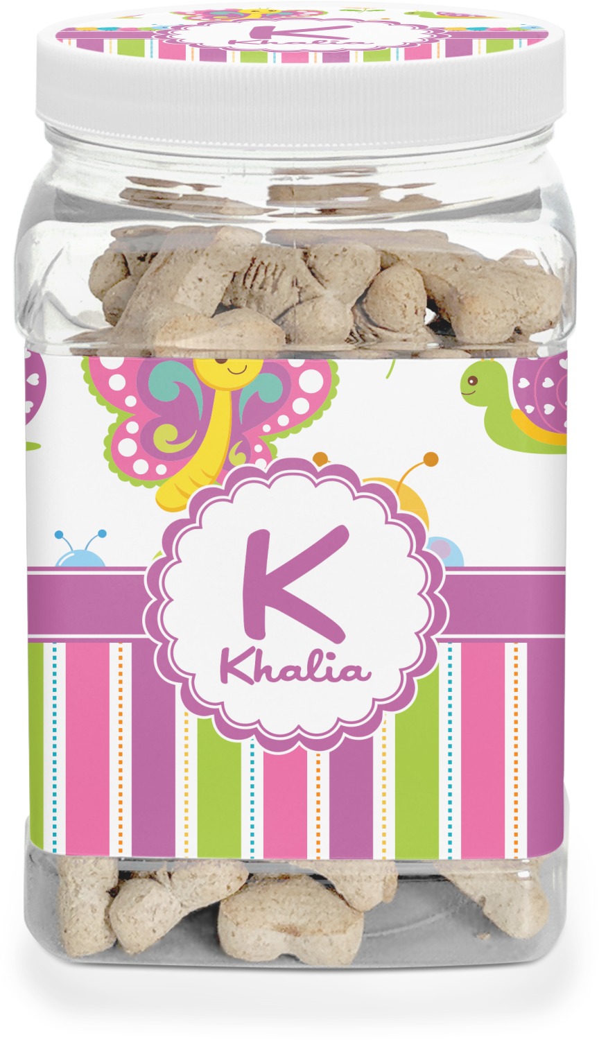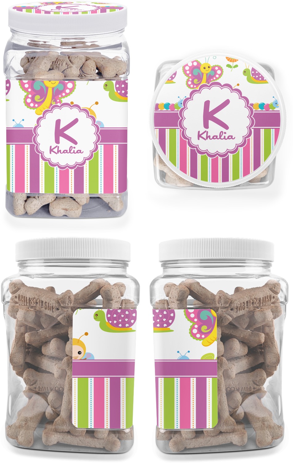 This half gallon jar, made from a sturdy plastic, is the perfect way to keep treats from any naughty pet paws, while still keeping them ready on hand for when your pup performs an impressive trick. This dog cookie jar features a screw-on, white lid that displays your personalized design on a vinyl sticker. We apply another customized sticker that wraps around the front and sides of the jar. Our dog treat jar also has indentations on the rear ends of the sides, which allows for convenient handling, and its square frame allows for easy storage.
