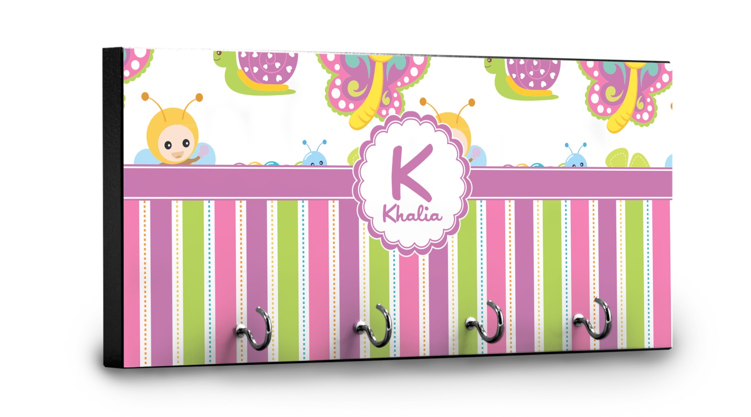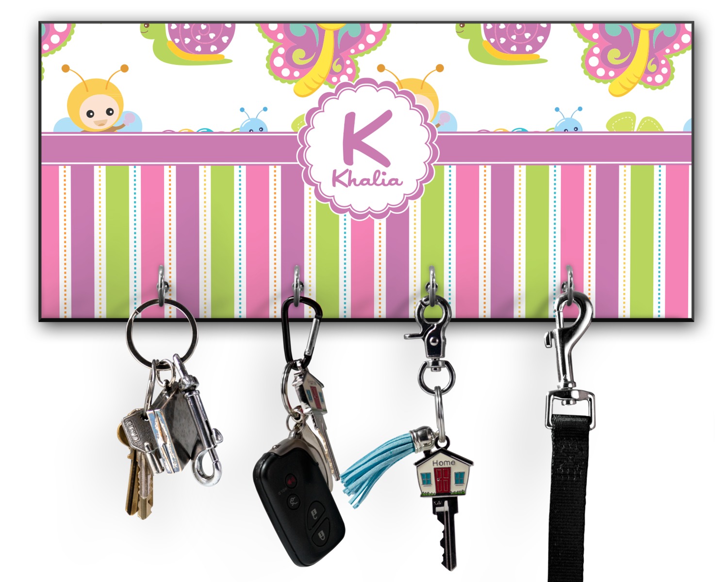 This 11" x 5" key hanger is made of sturdy wood and has four metal hooks lining the bottom. This is the perfect size for a family with several drivers. Not only can you hang keys on it though, but pet leashes and other small items. The board is black on the sides and back and is printed with the design of your choice on the front.