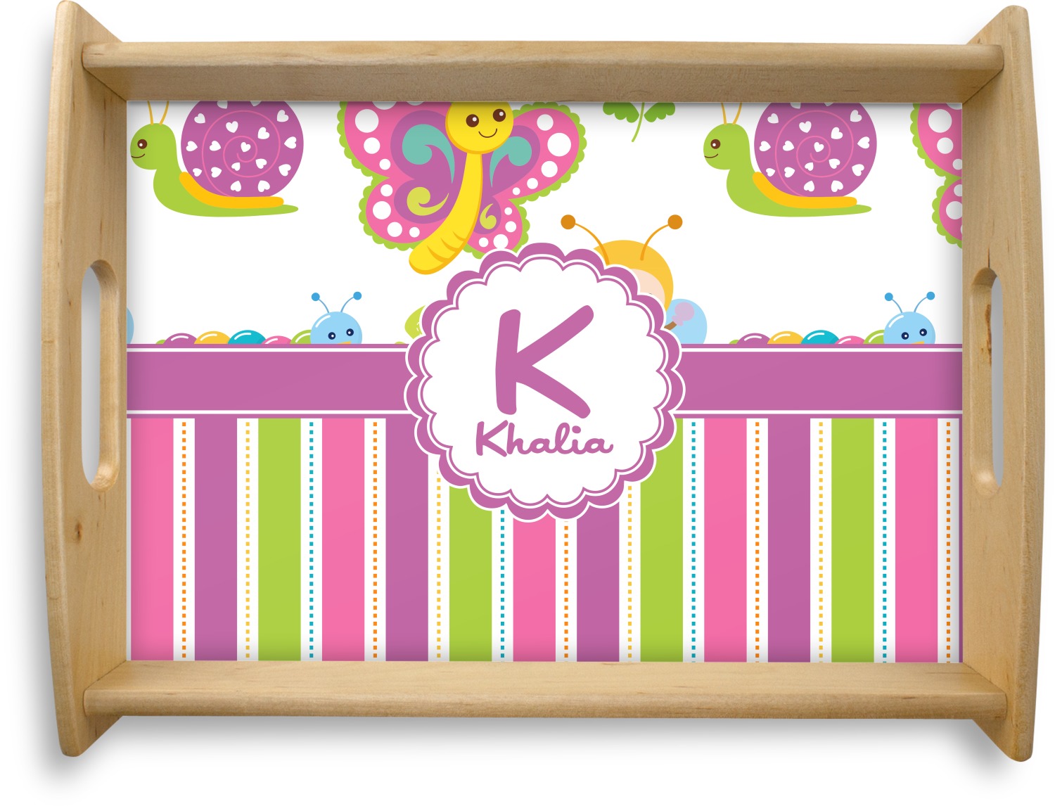This serving tray with handles features square edges and two rounded sides, creating a very modern look. Each side is fabricated from a beautifully cut, natural wood. The bottom of the interior of the tray displays your customized design in bright, vibrant color. The tray is sold in both a black color and a natural wood look. Each variation of the wood serving tray has two sizes: Small, which is 14" x 10" x 2.25", and Large, which is 19.5" x 13.5" x 2.75".