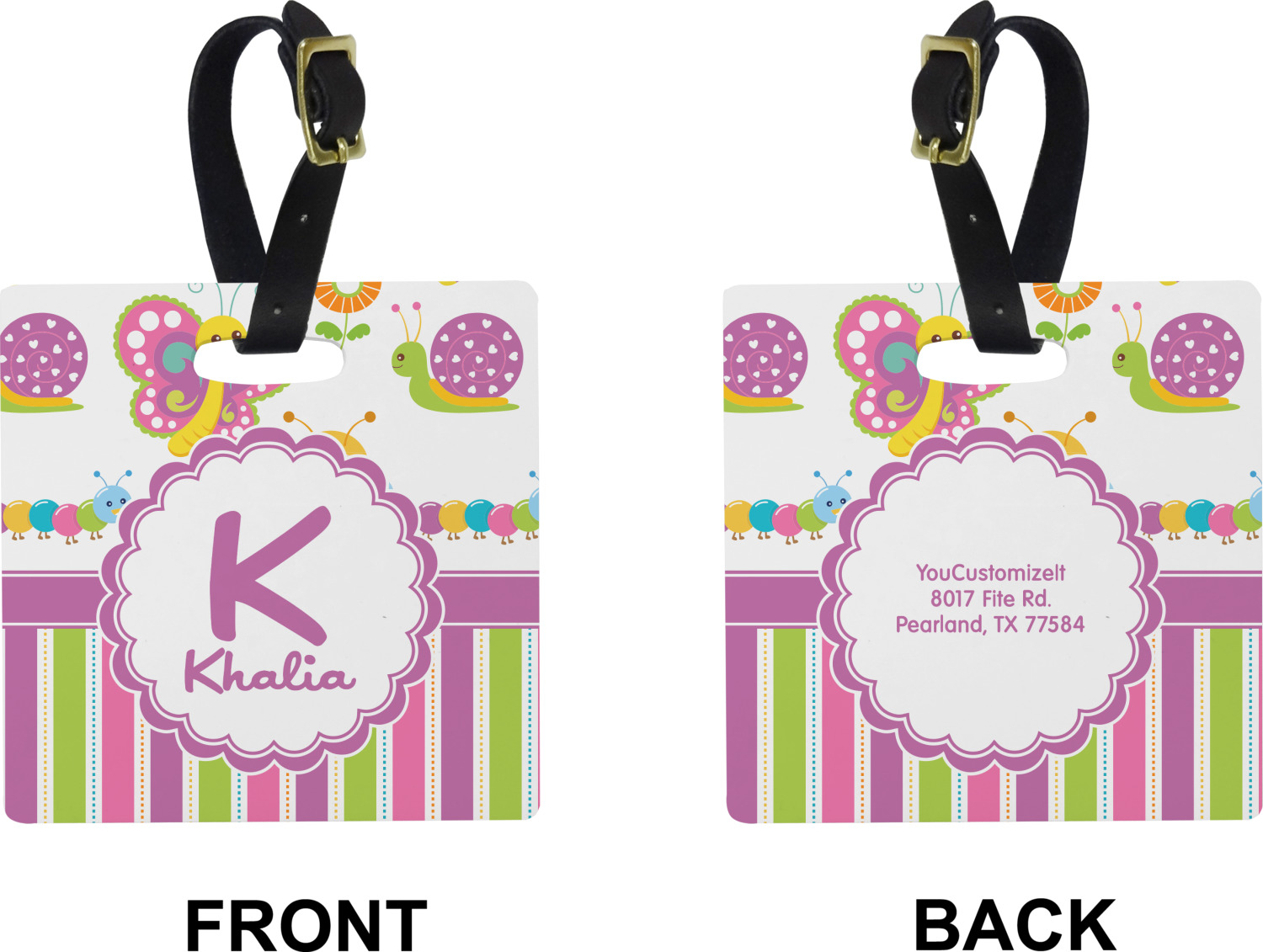 These cute luggage tags are made of a fiber-reinforced, UV-resistant plastic, making them waterproof and durable enough for both everyday use and the rugged adventures of any traveler! A leather strap with holes and a buckle is included with your purchase and can be used to attach your custom luggage tag to any suitcase, backpack, or duffel bag. You can design these travel tags as you wish; your customization will be displayed across the front, while the back will show as little or as much personal information as you want.